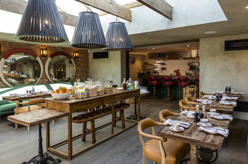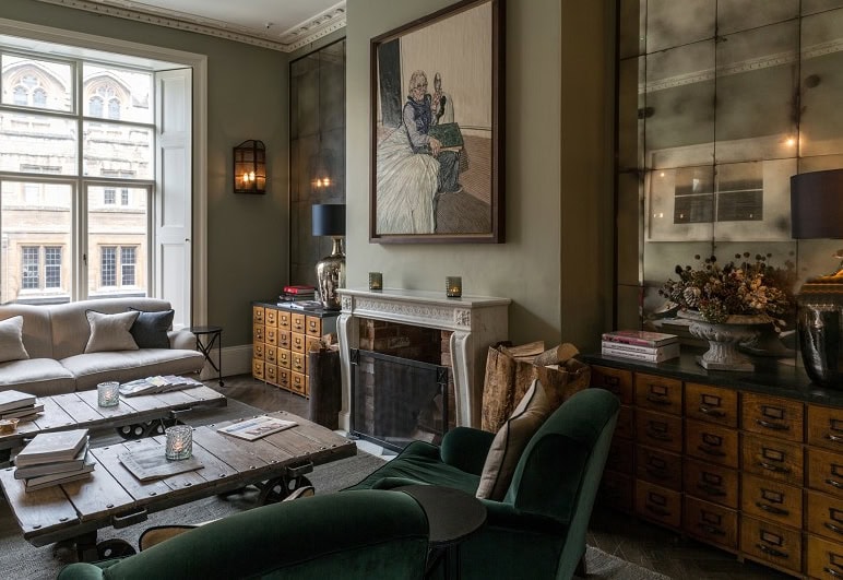 This image is from one of our excellent local hotels – certainly worth a visit if you are in the Cotswolds, No 38 The Park. We supplied the Czech Railway Mirrors on the wall and the Spanish Serving Table in the middle.