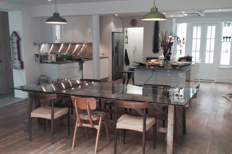 We have a lovely client who challenged us to find her a unique and interesting table – something fun with a lot of character. It took some time but eventually we found some very large Carpenters Trestles and we had this thick piece of glass cut to go on top and voila – here is the table in its new home.