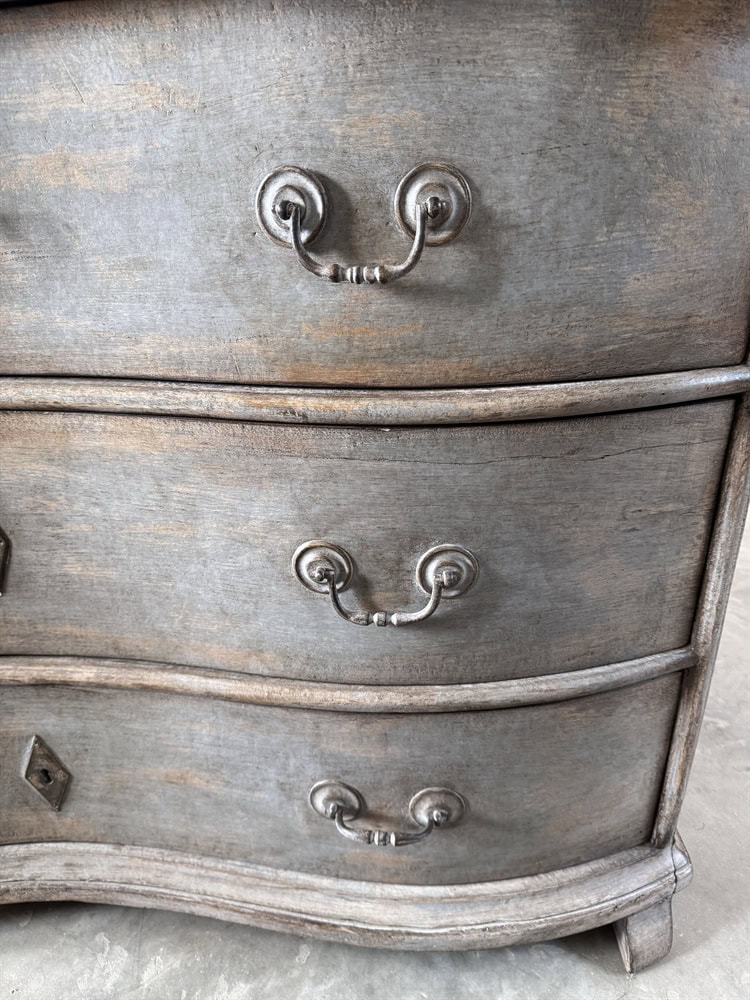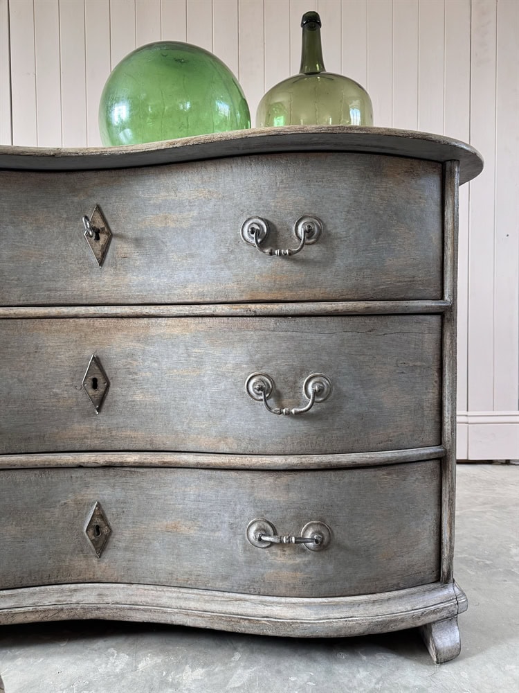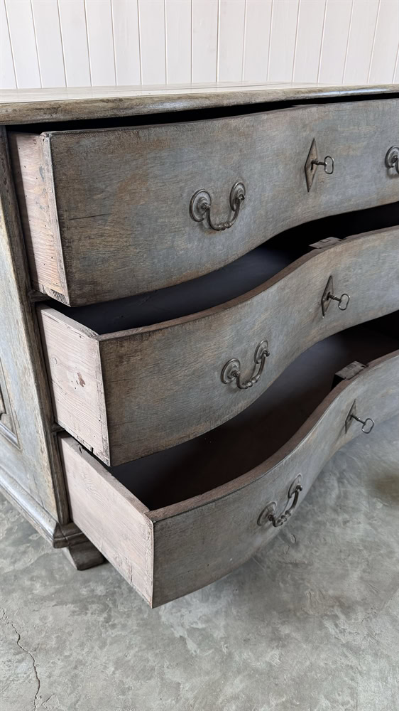 This is a striking example of an 18th Century French chest of drawers which features a classic serpentine front and retains its original soft grey paint.