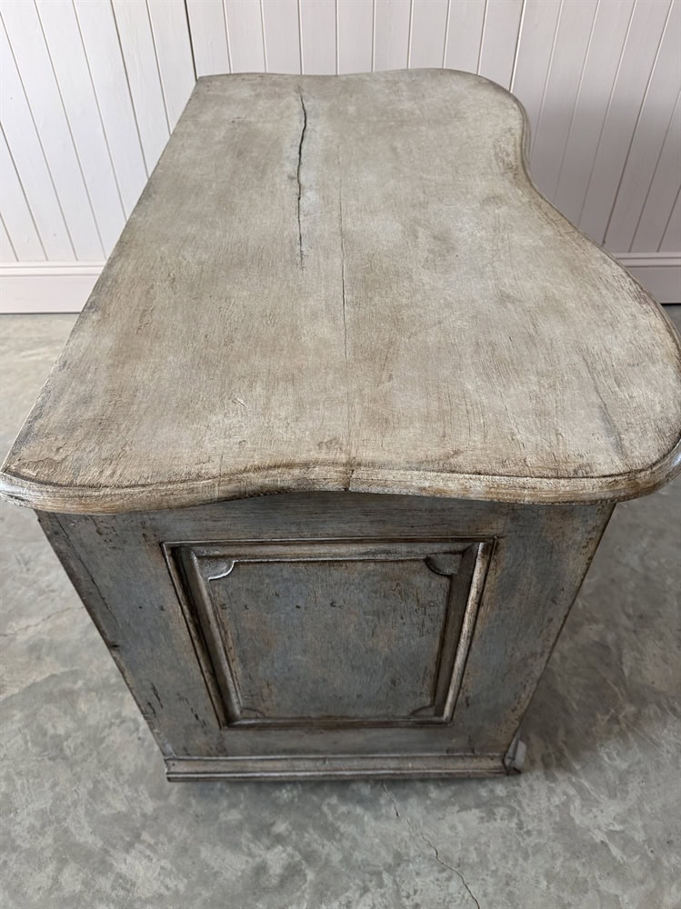 Classic craftsmanship of the period and the original grey paint reveals a patina that speaks to centuries of history and use. The piece has been re-varnished to seal in the natural patina.