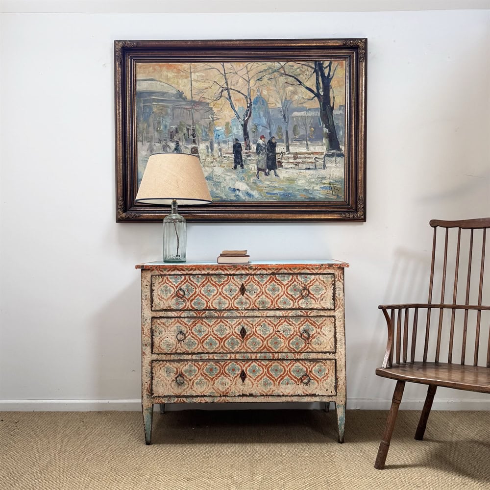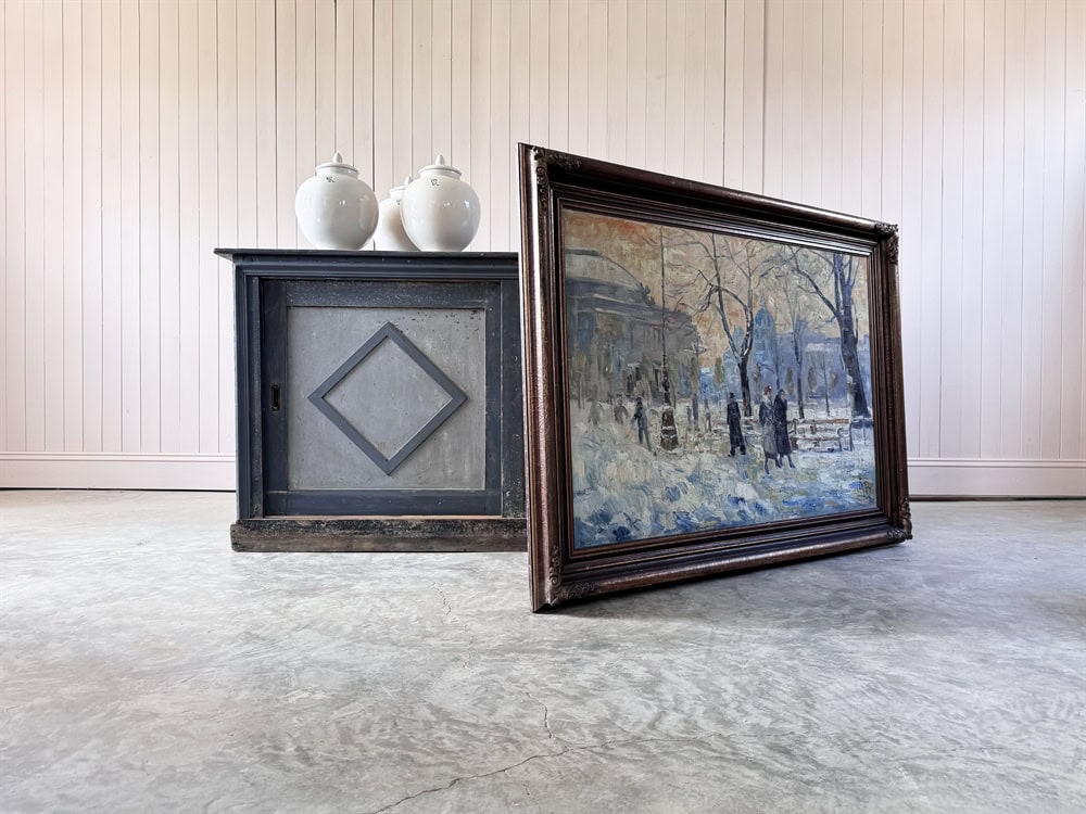 A classic early 20th century oil on canvas painting of a winter scene with the recognisable Paris landmarks.