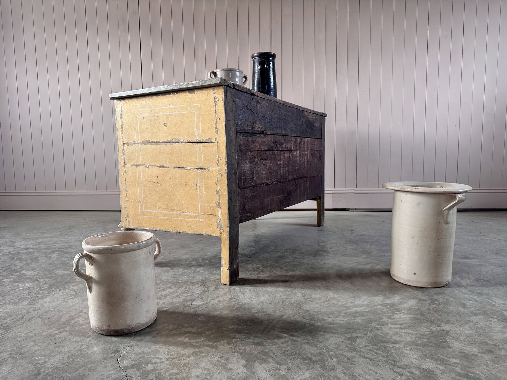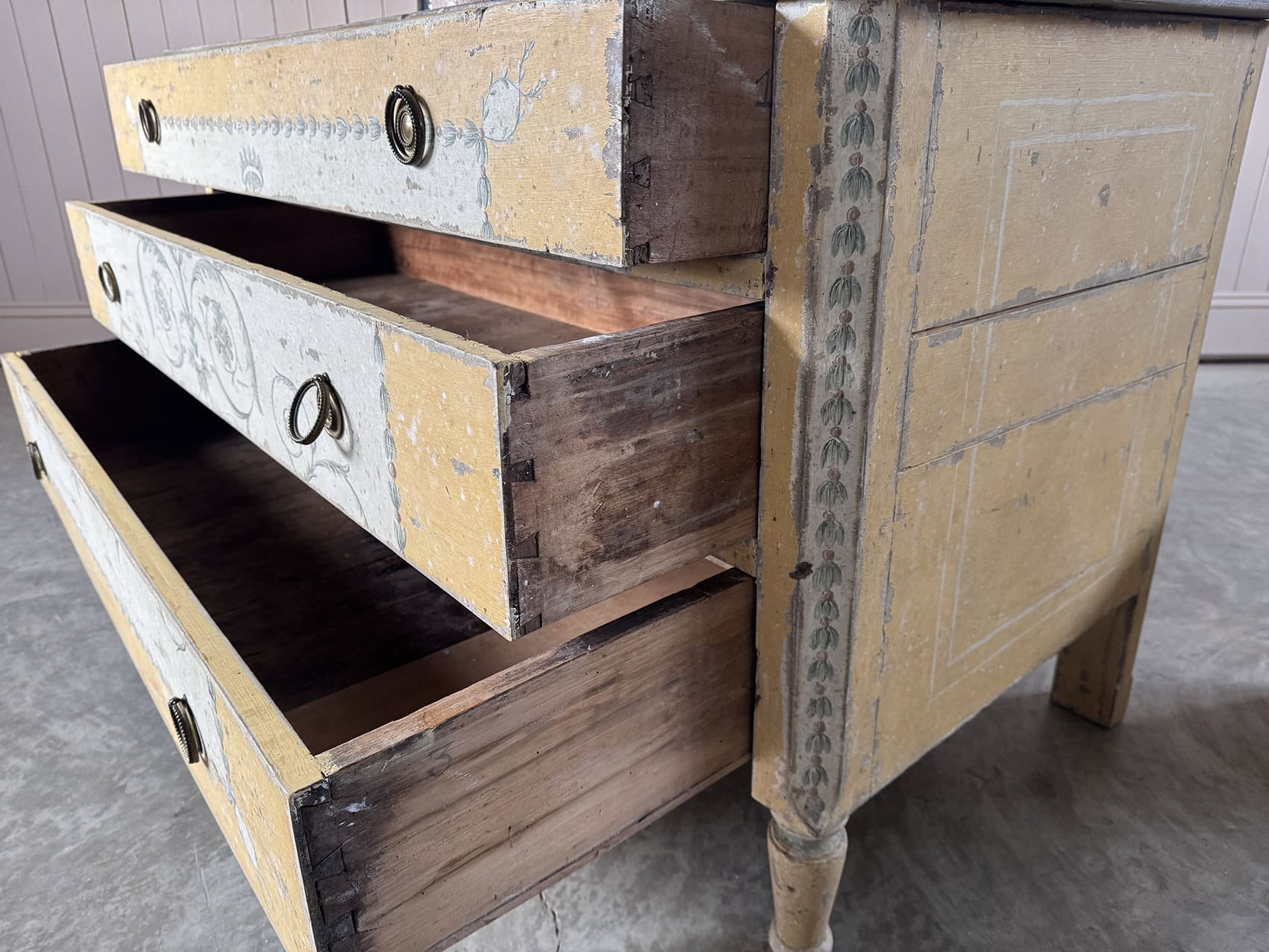 A charming French provincial chest of drawers, dating to the late 18th or early 19th century, finished in its original painted surface. The piece retains a beautifully timeworn palette of soft ochre and pale grey, enriched by delicate hand-painted neoclassical motifs to the drawer fronts. Standing on turned tapering legs, with later patinated brass ring pulls that sit comfortably with the overall aesthetic. The worn paint, visible brushstrokes, and gentle surface losses contribute to its authentic character and quiet elegance.