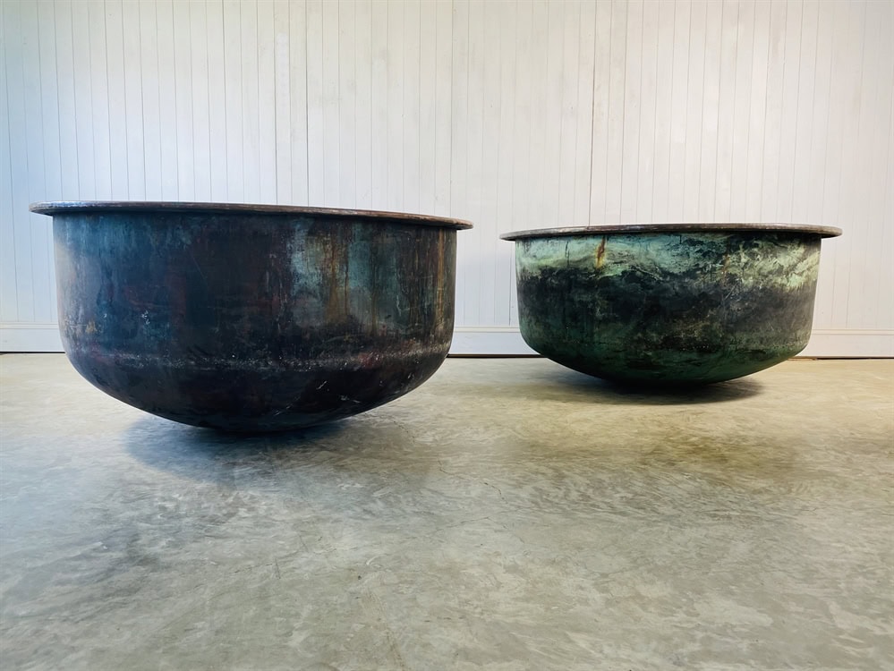 Vat on the right is darker with more verdigris 70 cm h x 150 diameter.