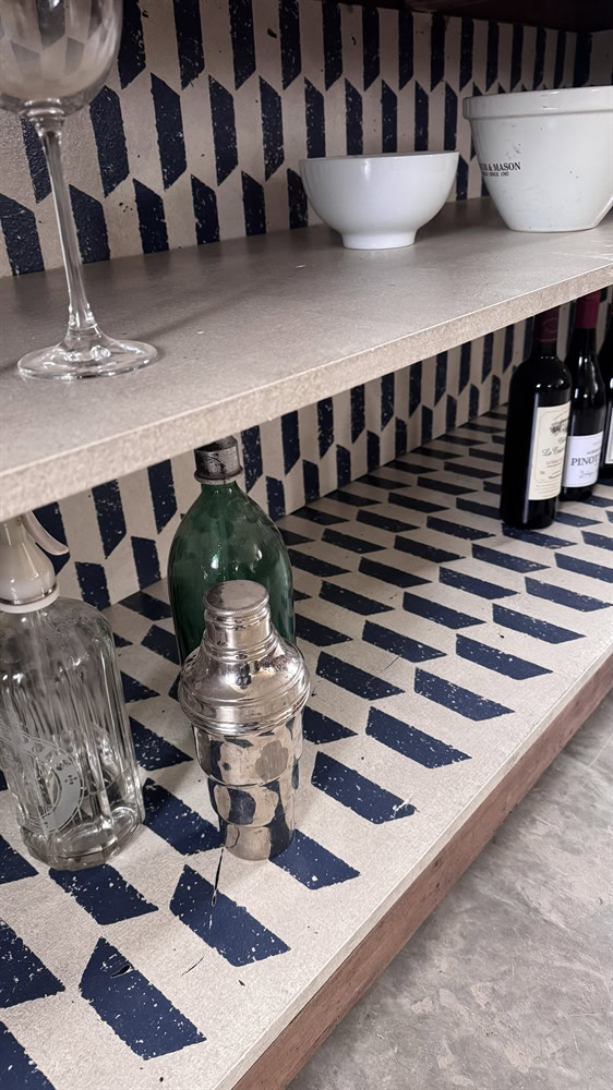 We have completely re-made the back of this antique bar, making it once again structurally sturdy to hold the heavy Carrara marble top - just for fun, as bars should be - we have painted this harlequin pattern inside.