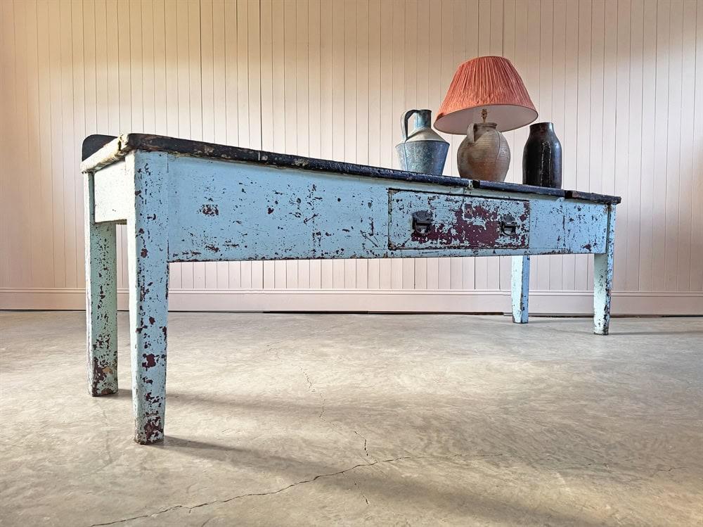 Some restoration and now very sturdy having re-built the top. It's important to us that a table is strong enough to dance on !! We have also sealed the top with a matt lacquer.