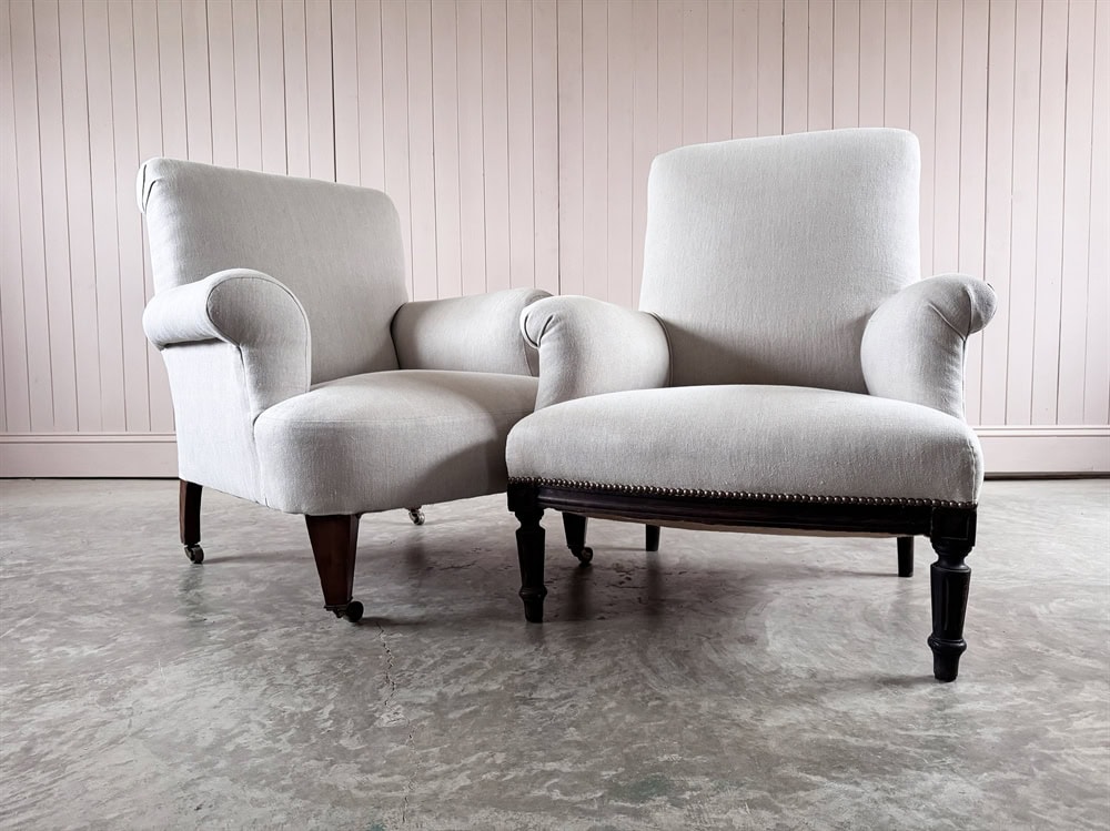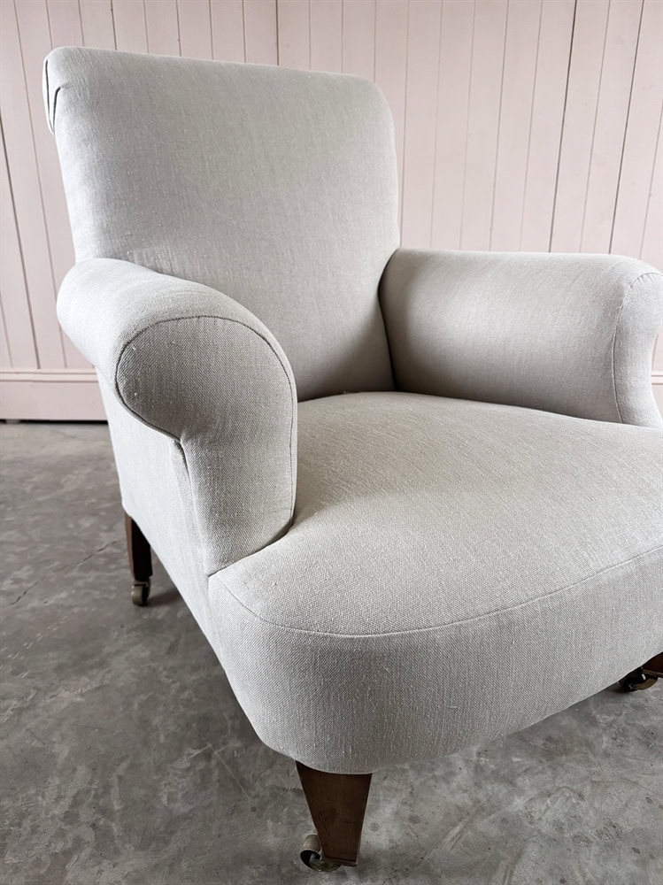 Circa 1920's Antique armchair reupholstered in a soft grey linen.