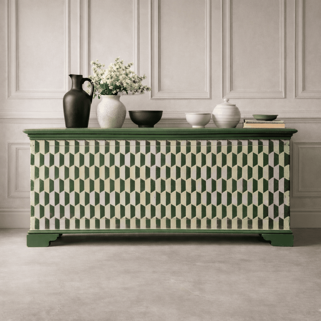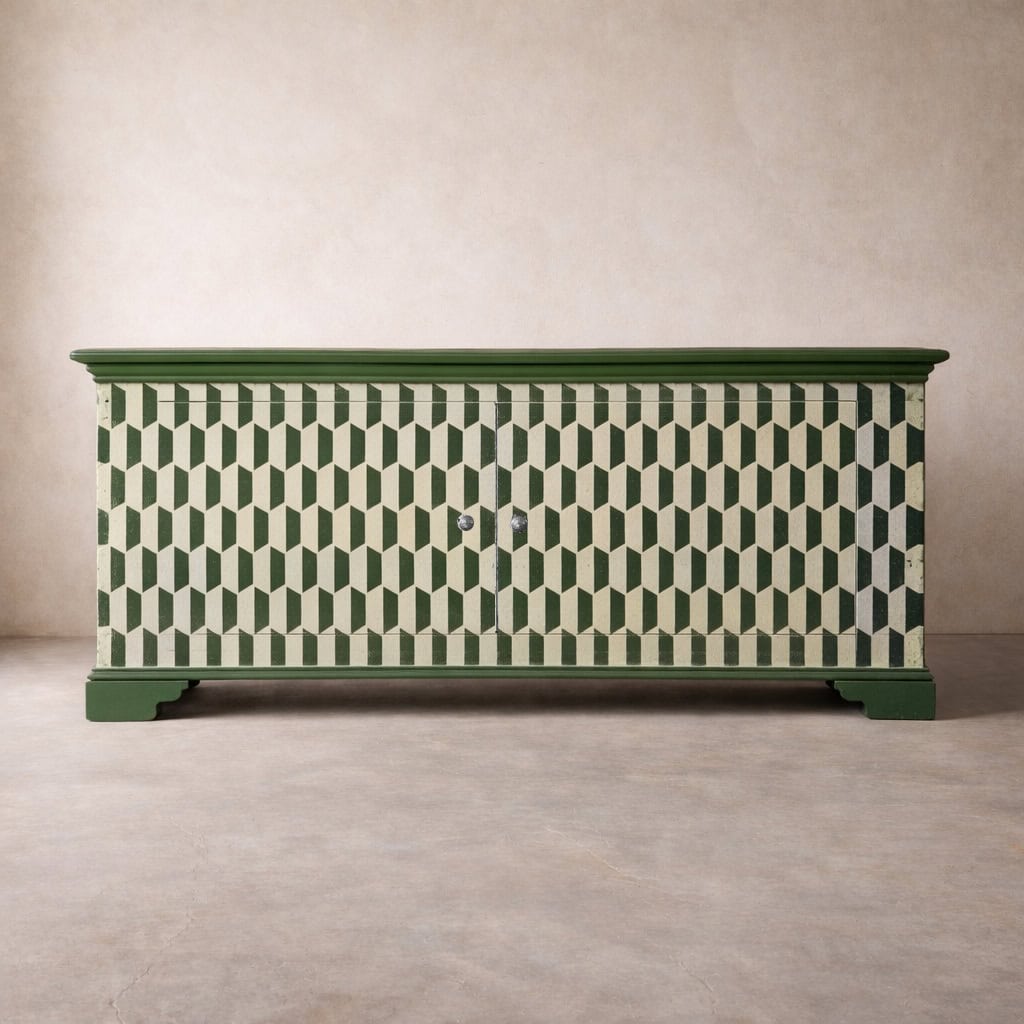 This decorative chevron painted sideboard was a commission. Painted in Bancha Green by Farrow and Ball. This client wanted this with hardly any patina / distressing.