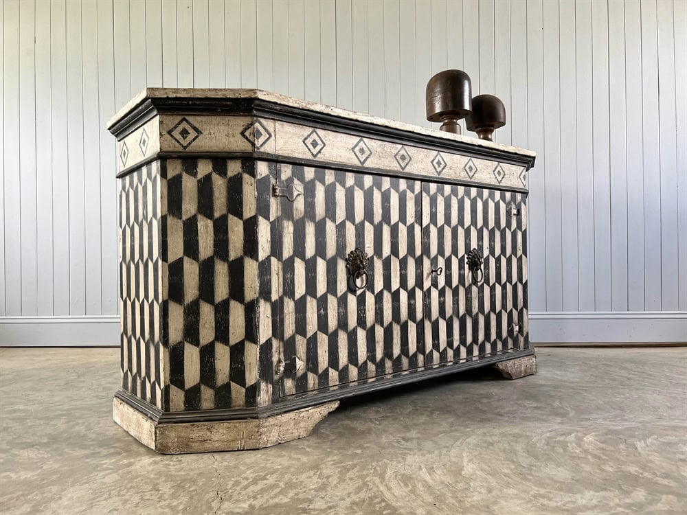 Based on an Italian harlequin design we are now having these cupboards made locally in the Cotswolds and painting the designs in-house.