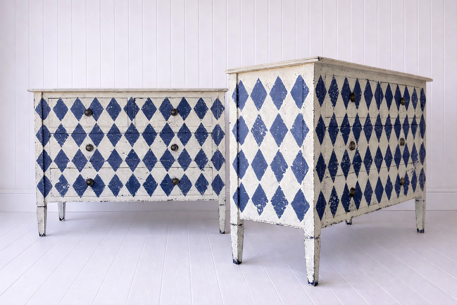 Each piece is newly made from sustainable mango wood and decorated using traditional techniques, resulting in a richly distressed surface with a soft, timeworn feel. The classic harlequin pattern brings a bold yet timeless decorative element, while the patina adds warmth and authenticity.