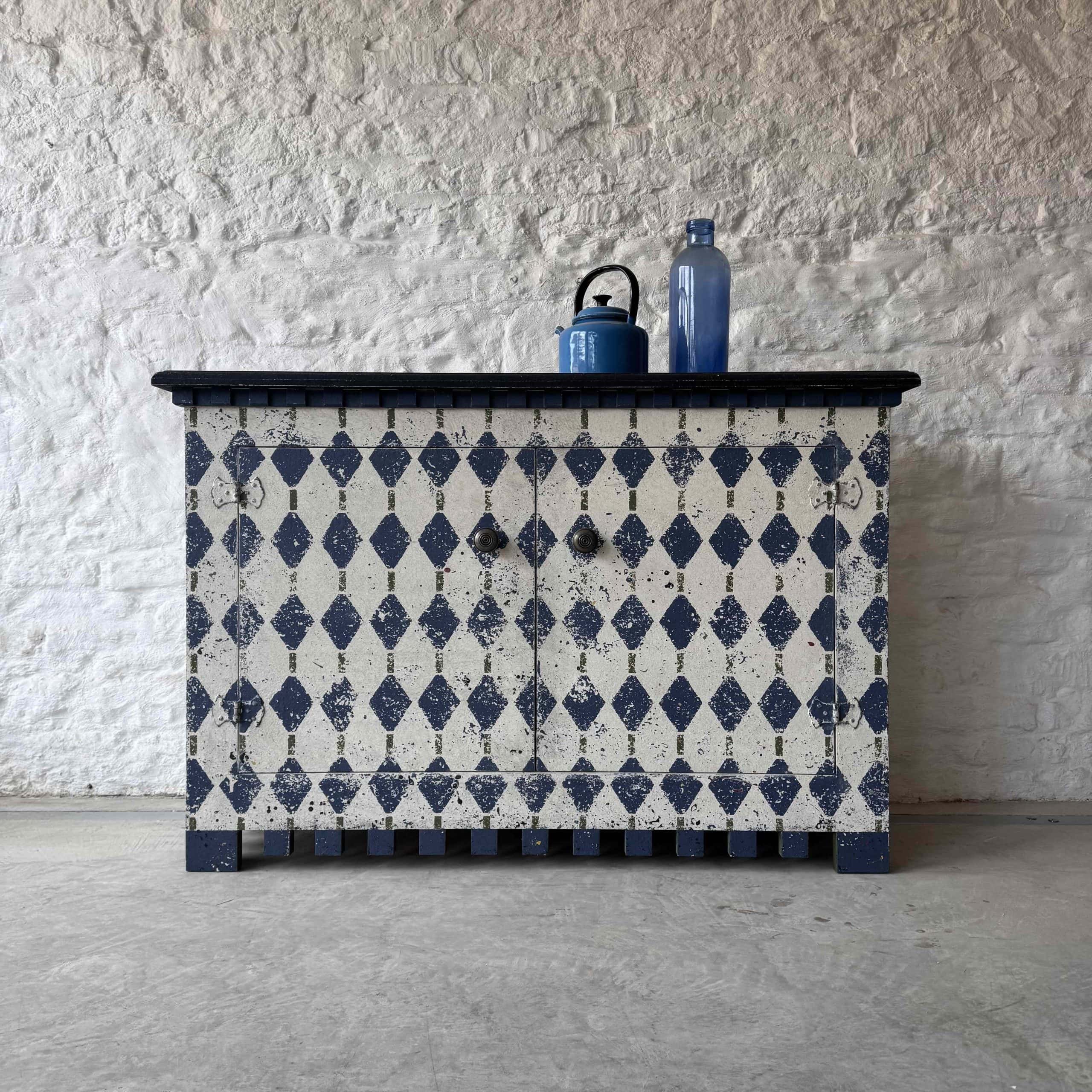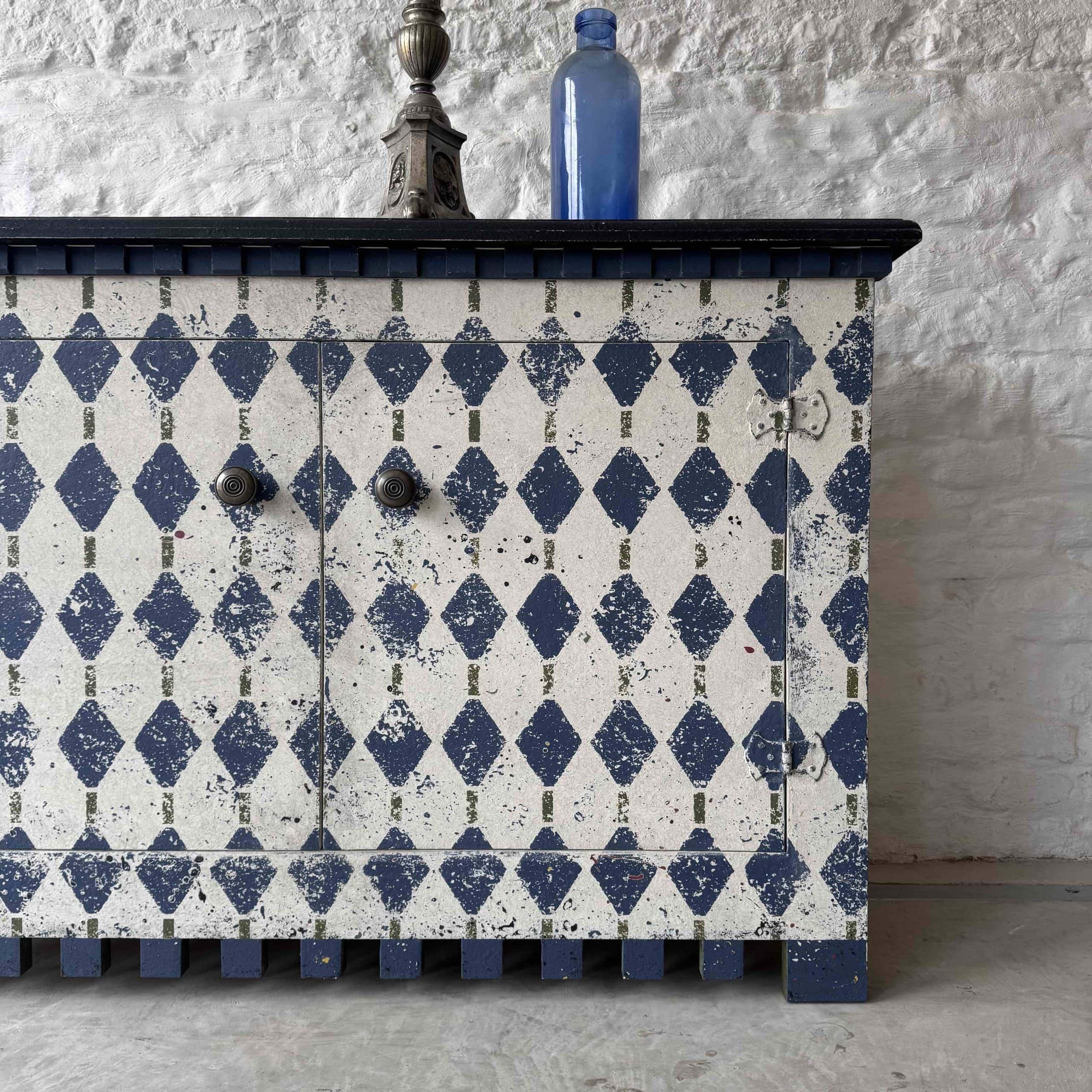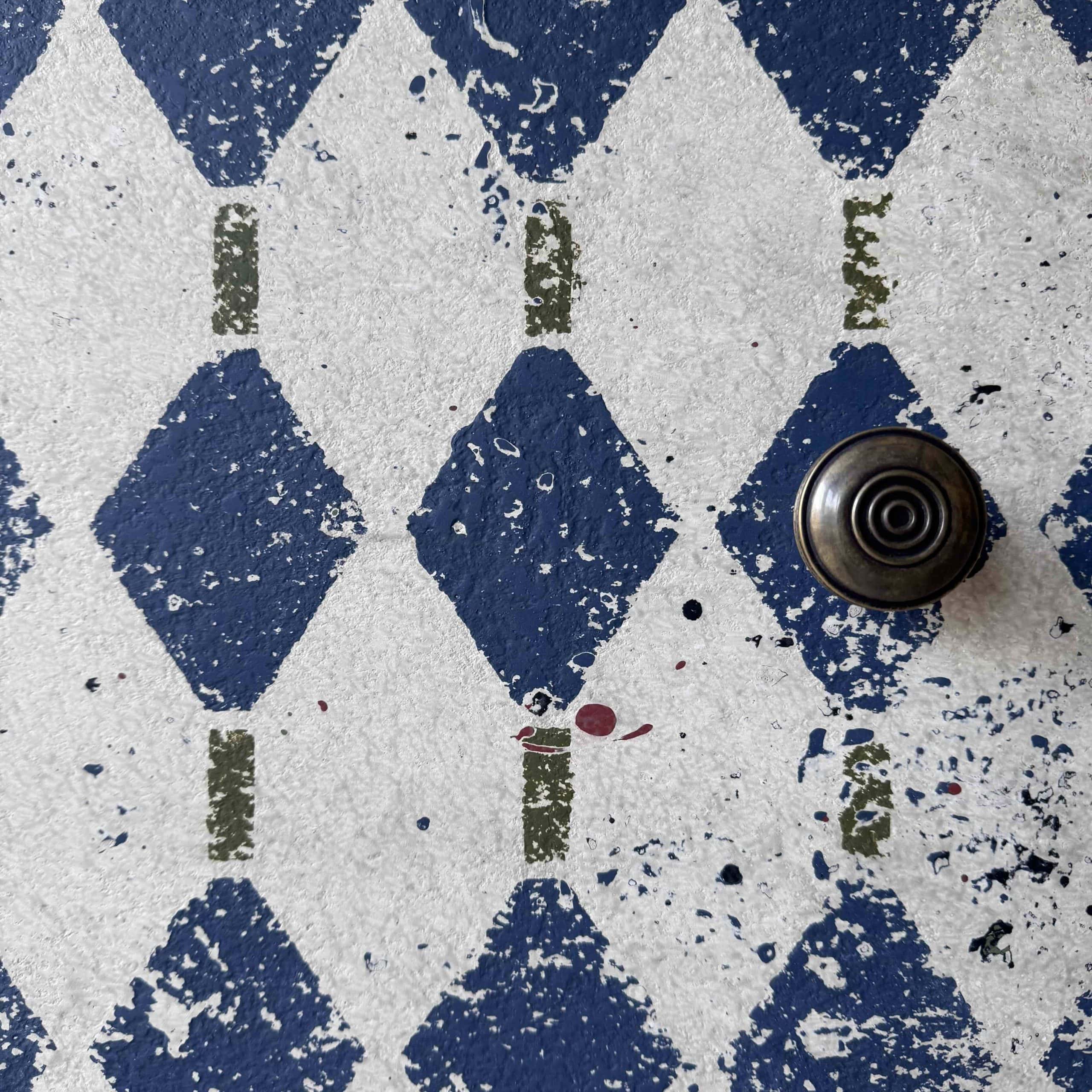 The harlequin pattern is Stiffkey Blue with hints of Bancha Green by Farrow and Ball - with lots of other colours coming through the many layers of paint.