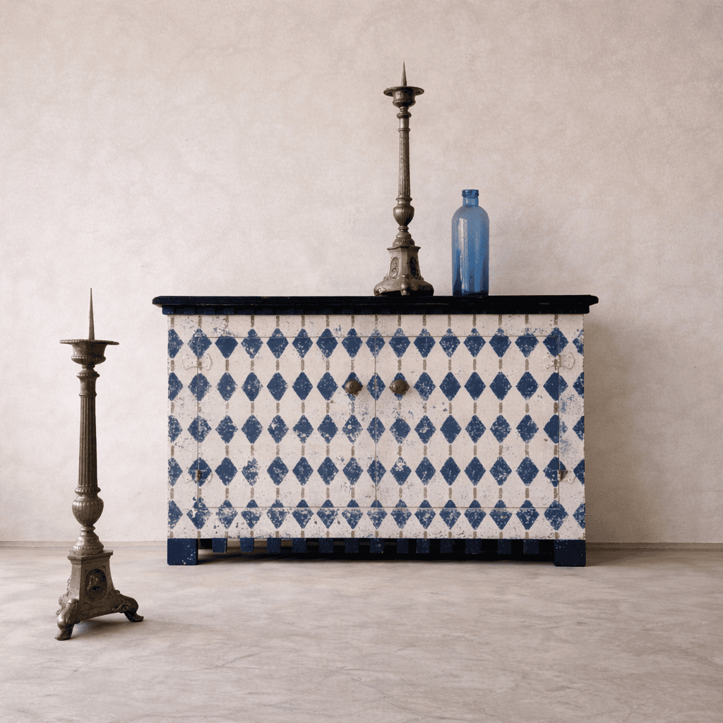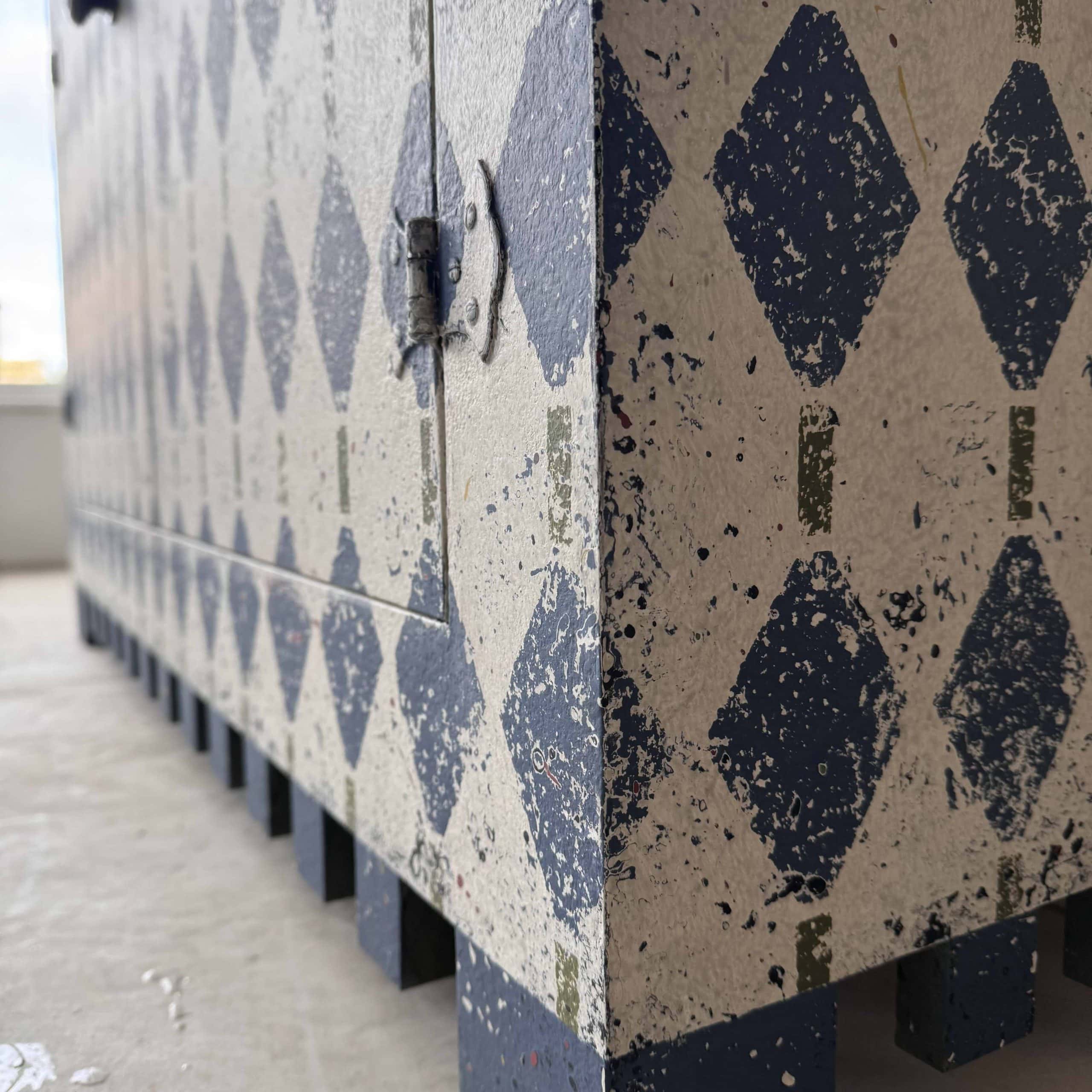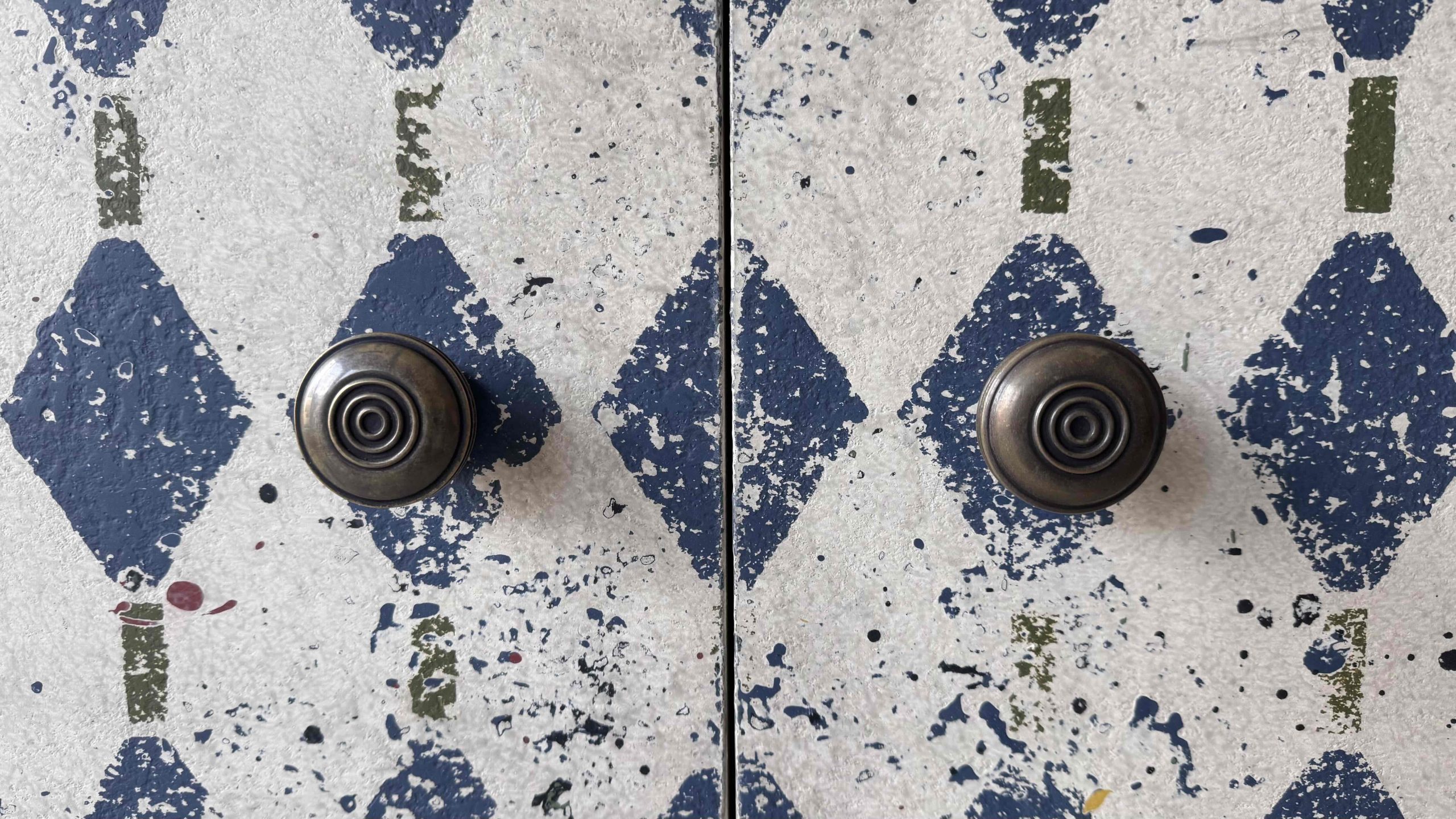 The harlequin pattern is Stiffkey Blue with hints of Bancha Green by Farrow and Ball - with lots of other colours coming through the many layers of paint.