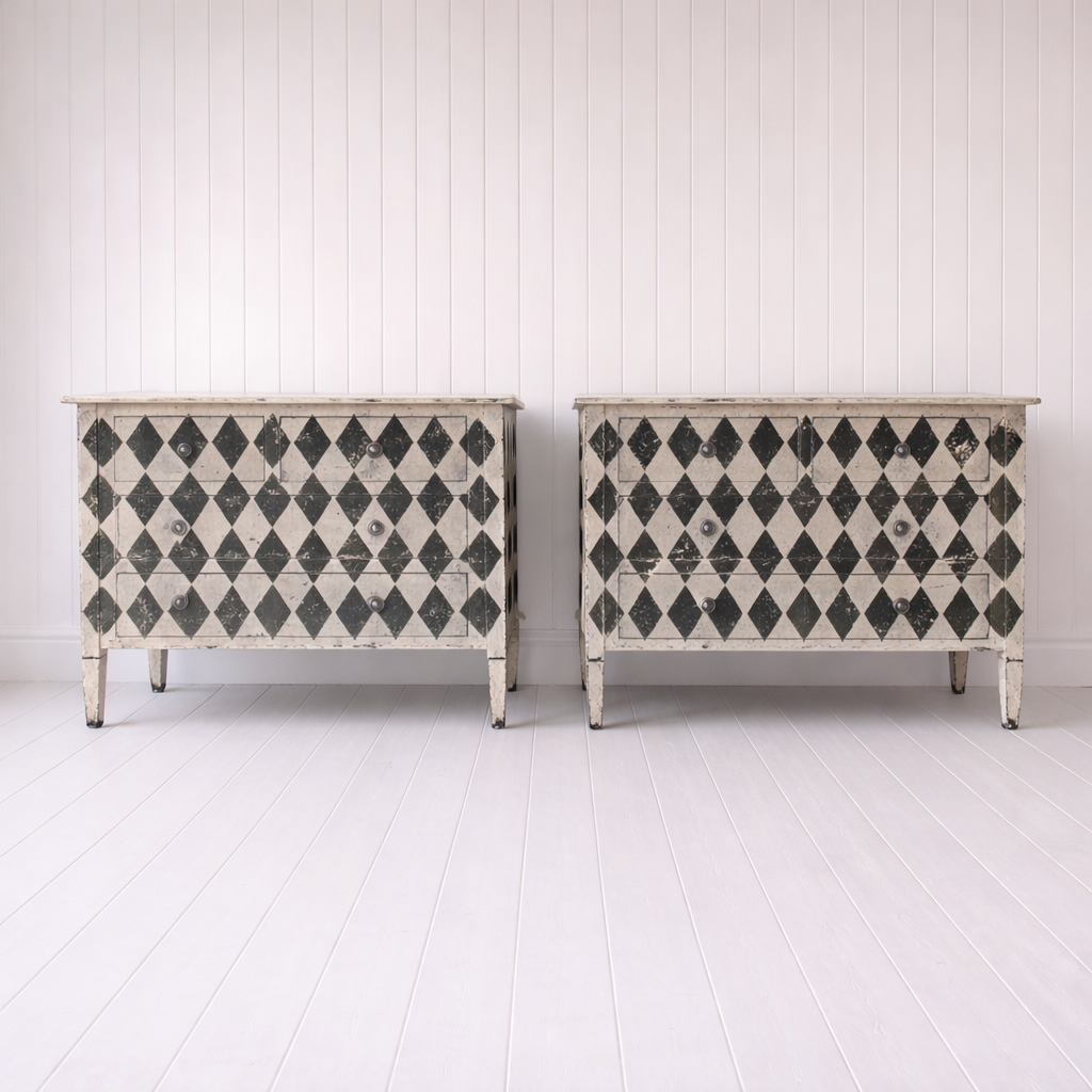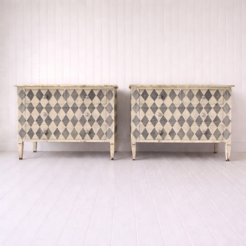 Each piece is newly made from sustainable mango wood and decorated using traditional techniques, resulting in a richly distressed surface with a soft, timeworn feel. The classic harlequin pattern brings a bold yet timeless decorative element, while the patina adds warmth and authenticity.