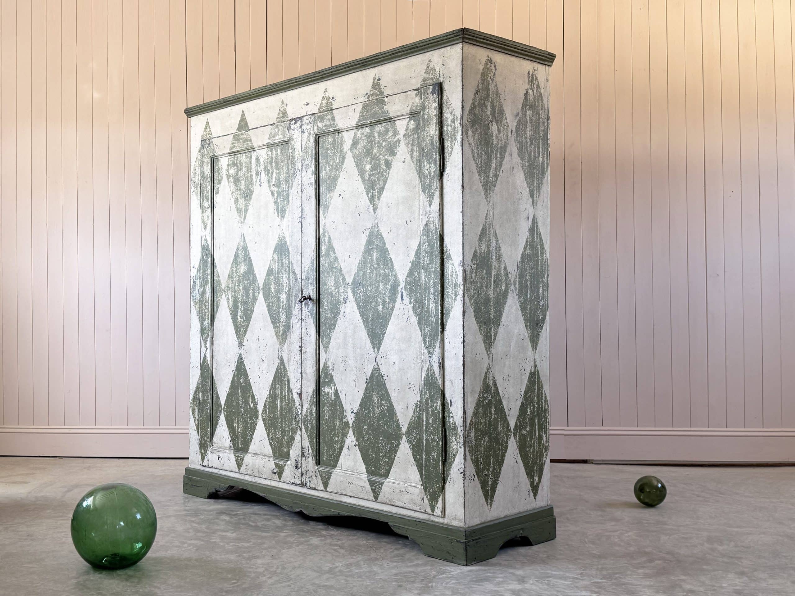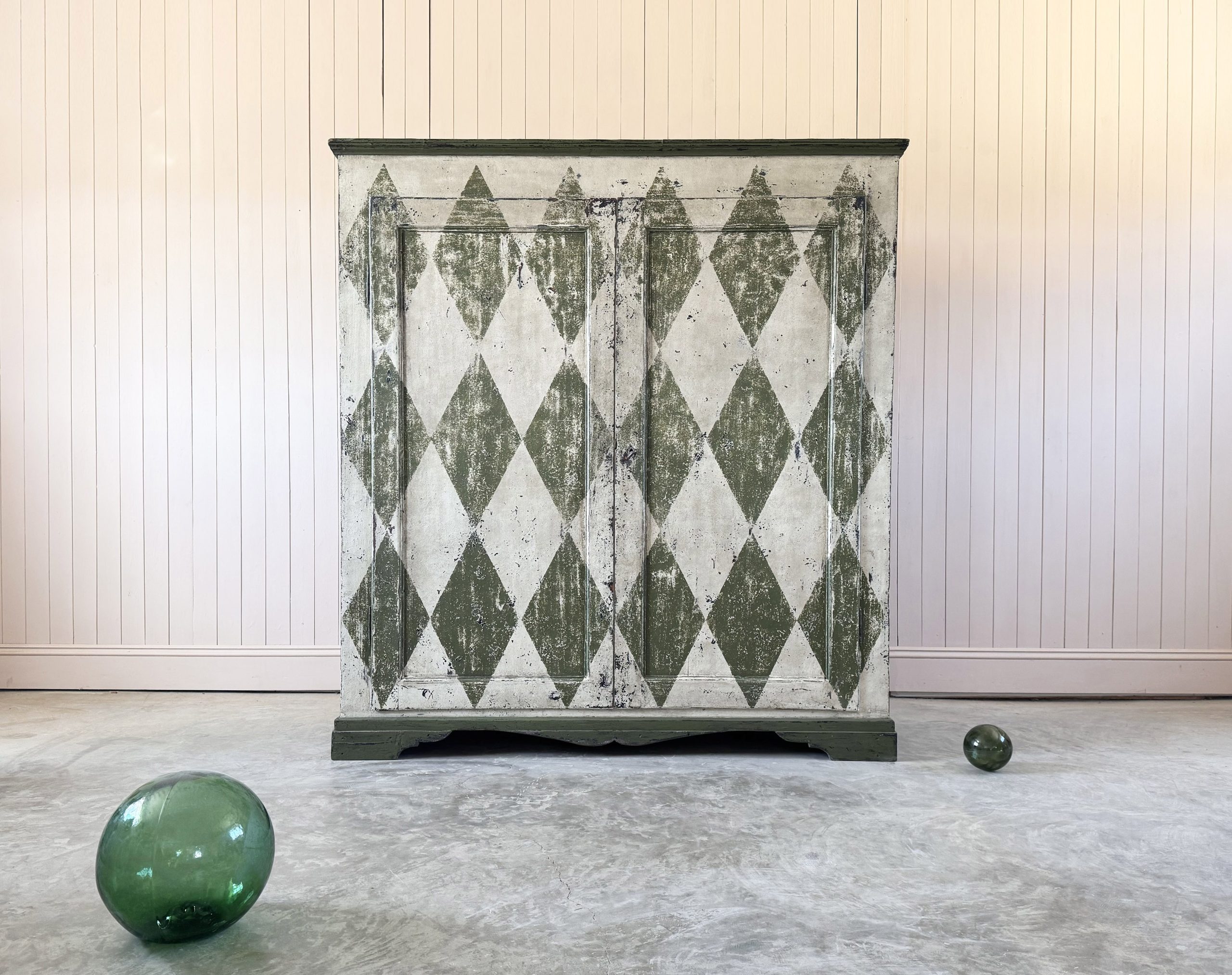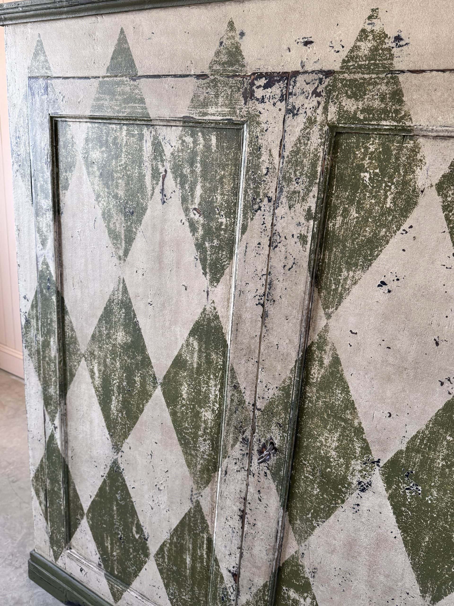 Originally painted but rather on the plain side so we have re-painted it with this giant harlequin design. The green is Bancha by Farrow and Ball.