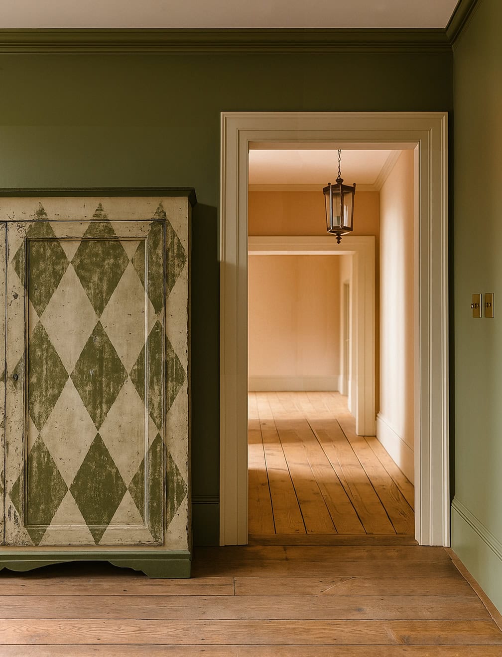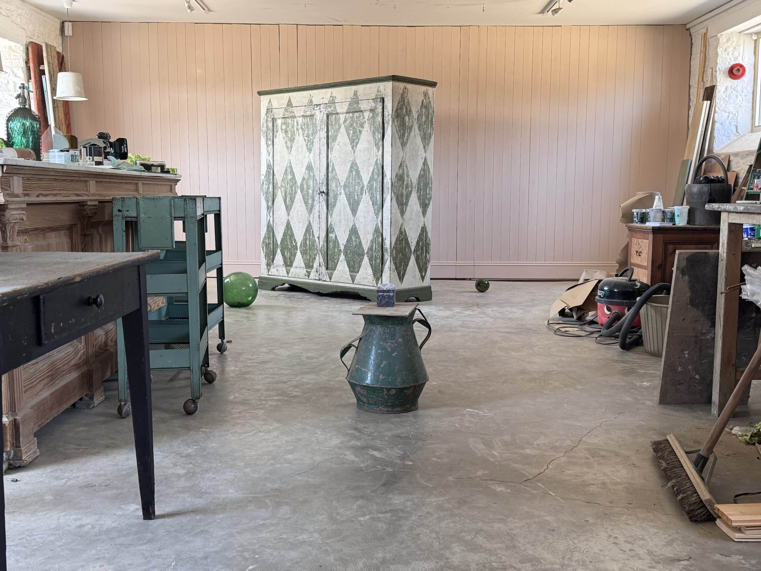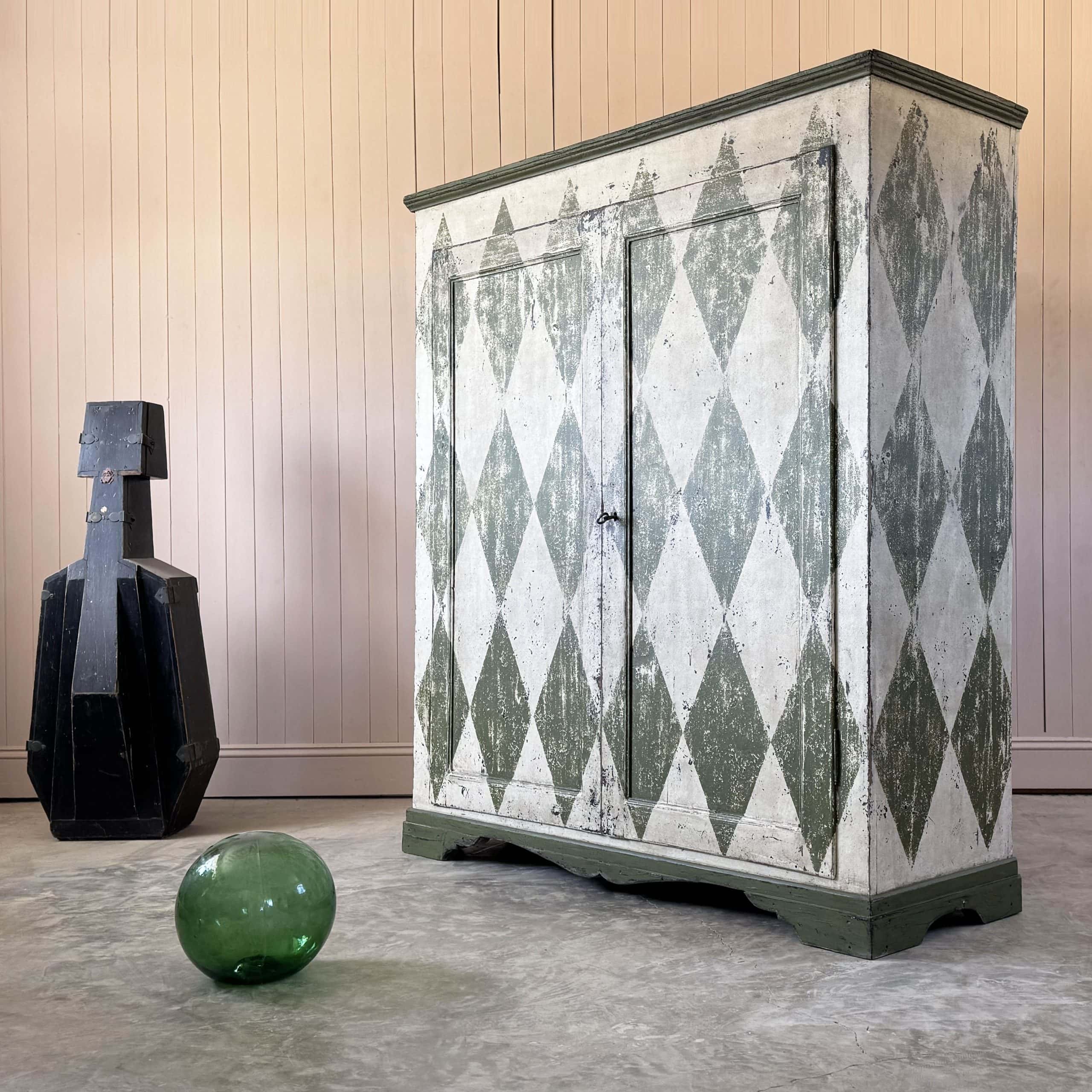 Originally painted but rather on the plain side so we have re-painted it with this giant harlequin design. The green is Bancha by Farrow and Ball.