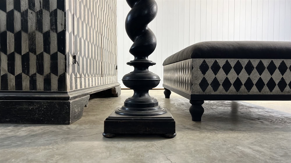 Made from tulip, pine and birch ply for strength and painted using many layers of hand mixed blacks and off whites and upholstered with a heavy slate linen. These boxes are designed with seats that lift up with storage underneath. The paint is sealed with a crystal hard matt lacquer.
