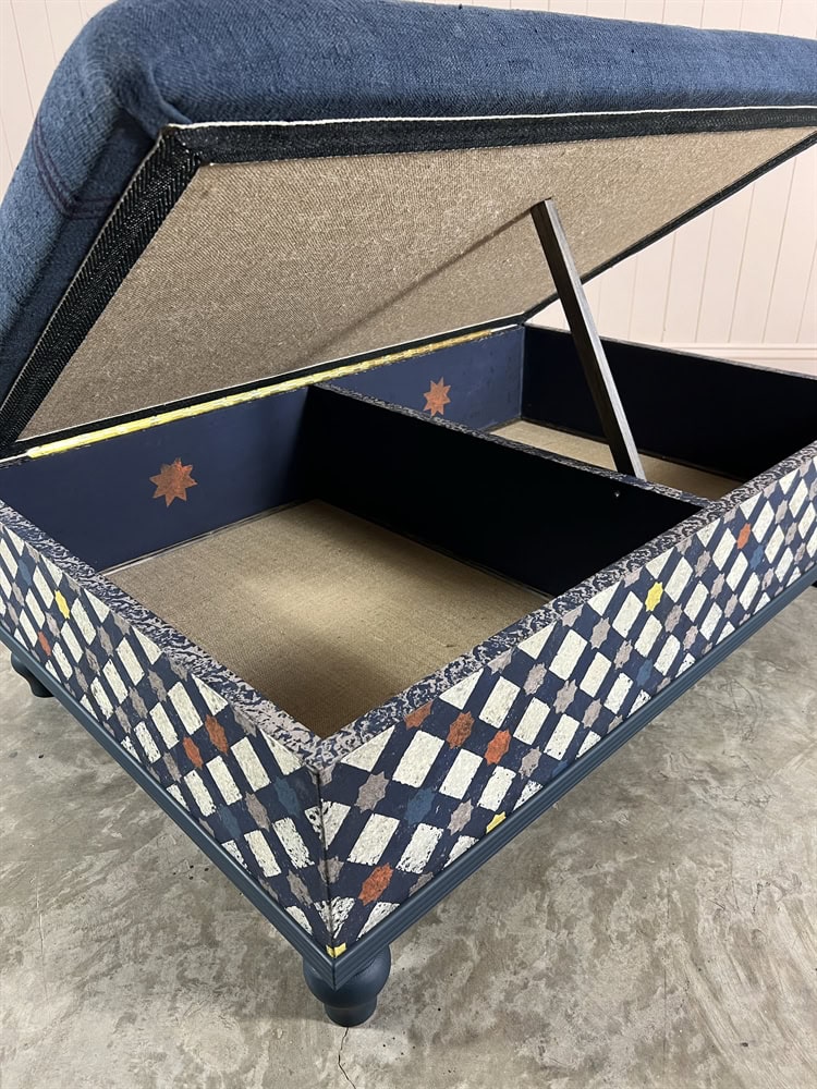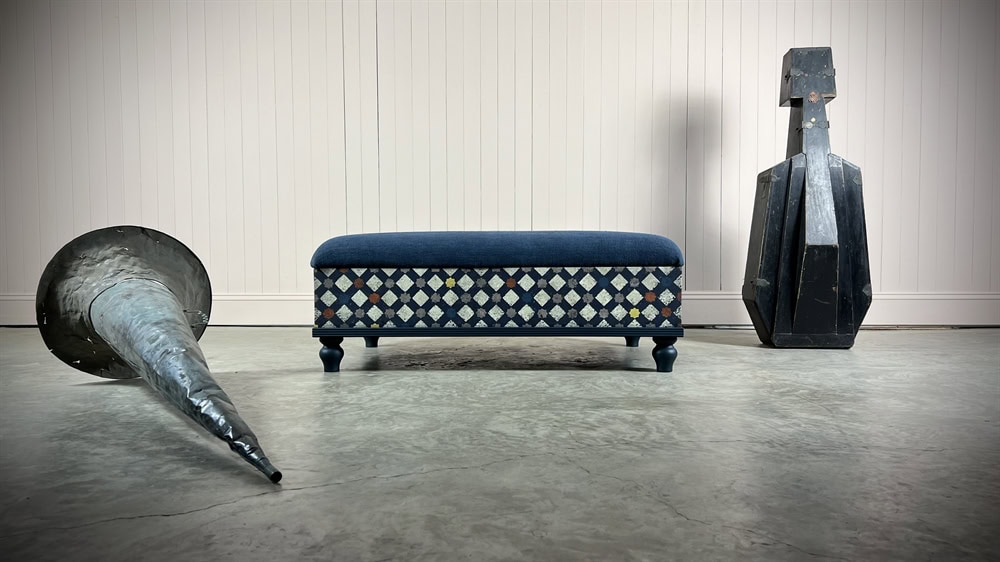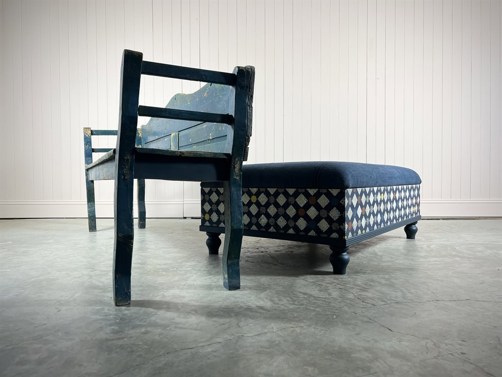 Made from Tulip wood and decoratively painted using many layers of colours and upholstered with a vintage Hungarian grain sack. The paint is then sealed with a diamond hard matt varnish. These boxes are designed with seats that lift up with storage underneath.