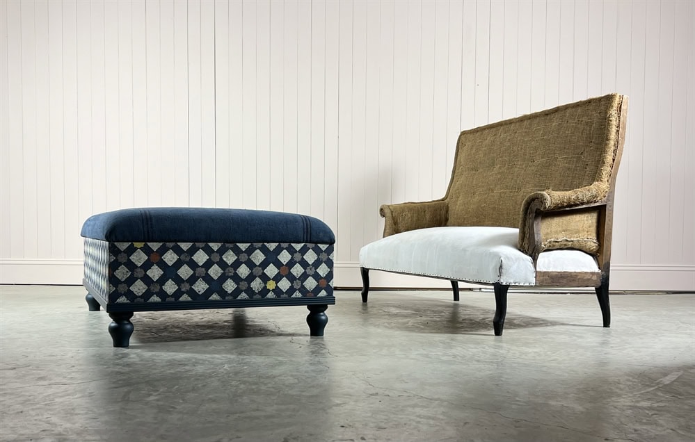 The inspiration for these footstools came from an antique Italian Ottoman which we bought and sold with a similar construction.