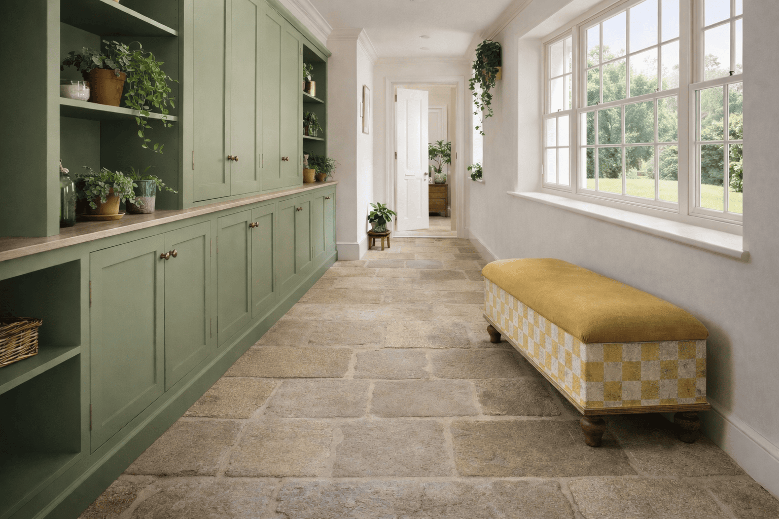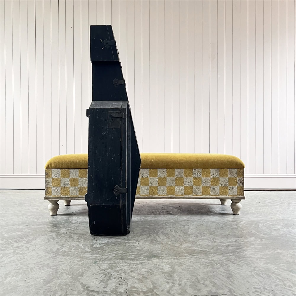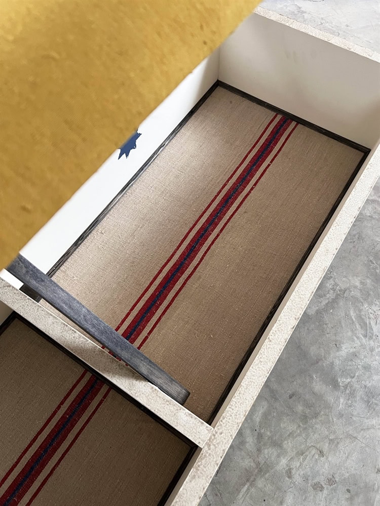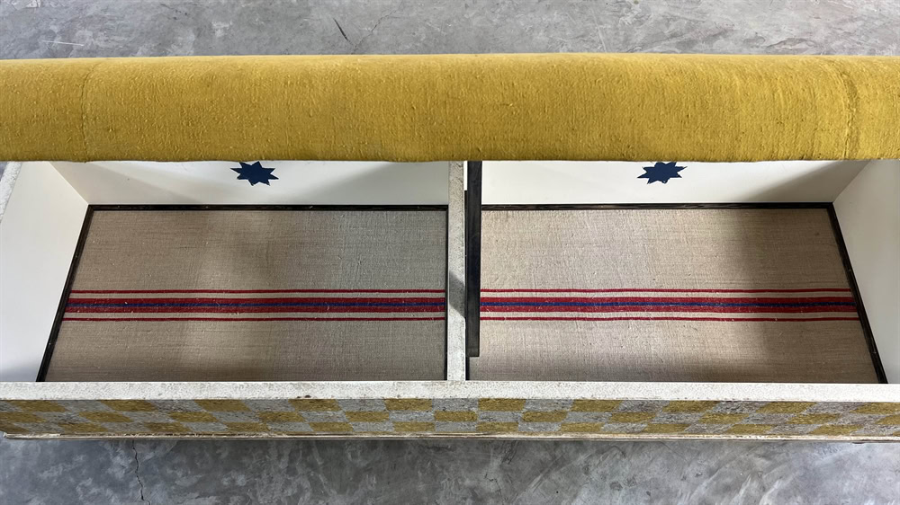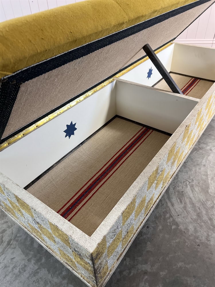 Made from tulip wood and painted using many layers of colours and upholstered in a stunning antique Italian linen. These boxes are designed with lids that lift up with masses of storage underneath.
