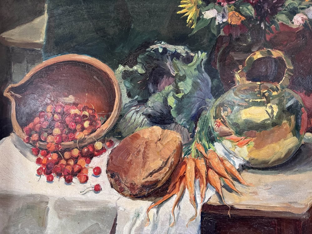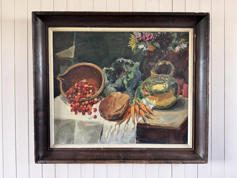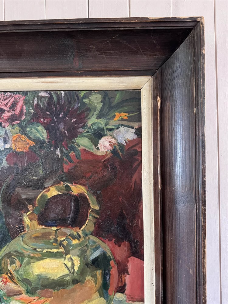 This vintage still life painting is an oil on board piece, signed and dated 1941, with a rich palette and strong sense of composition.