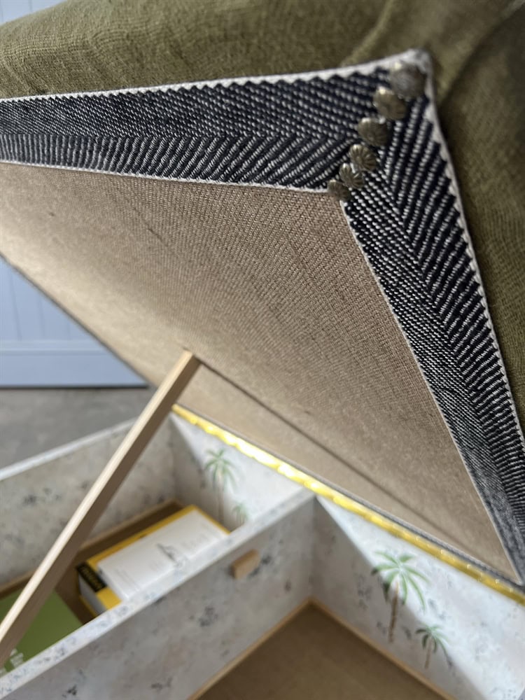 Made from solid timbers and painted using many layers of colours and upholstered with a Cloth Shop heavyweight linen. These boxes are designed with seats that lift up with storage underneath.