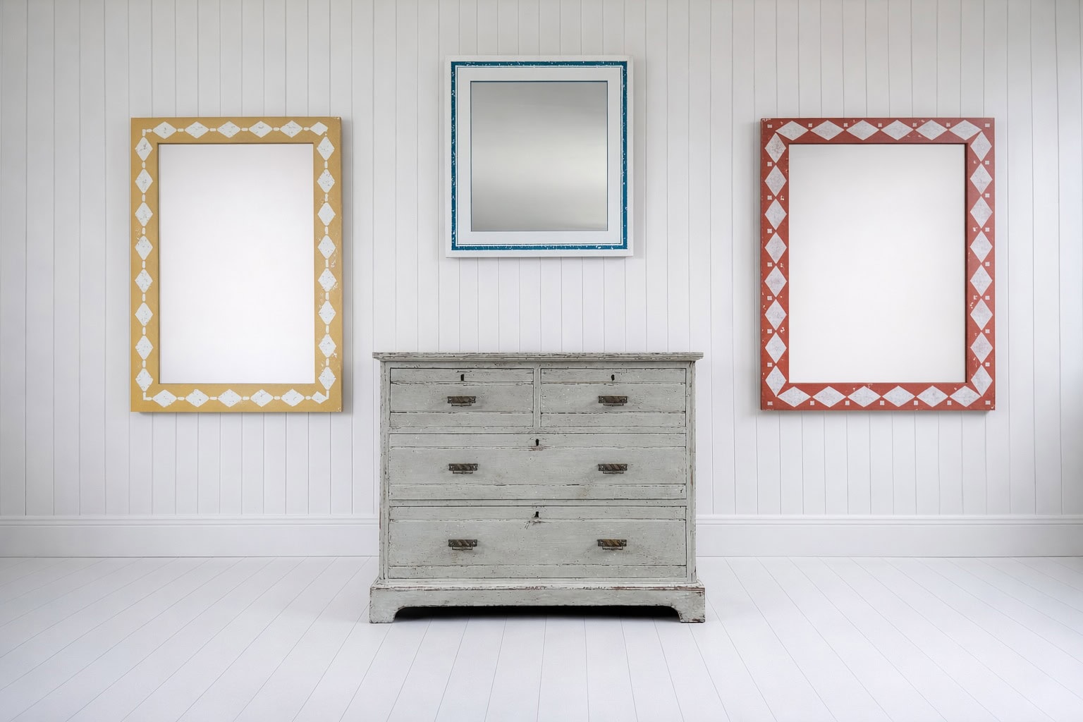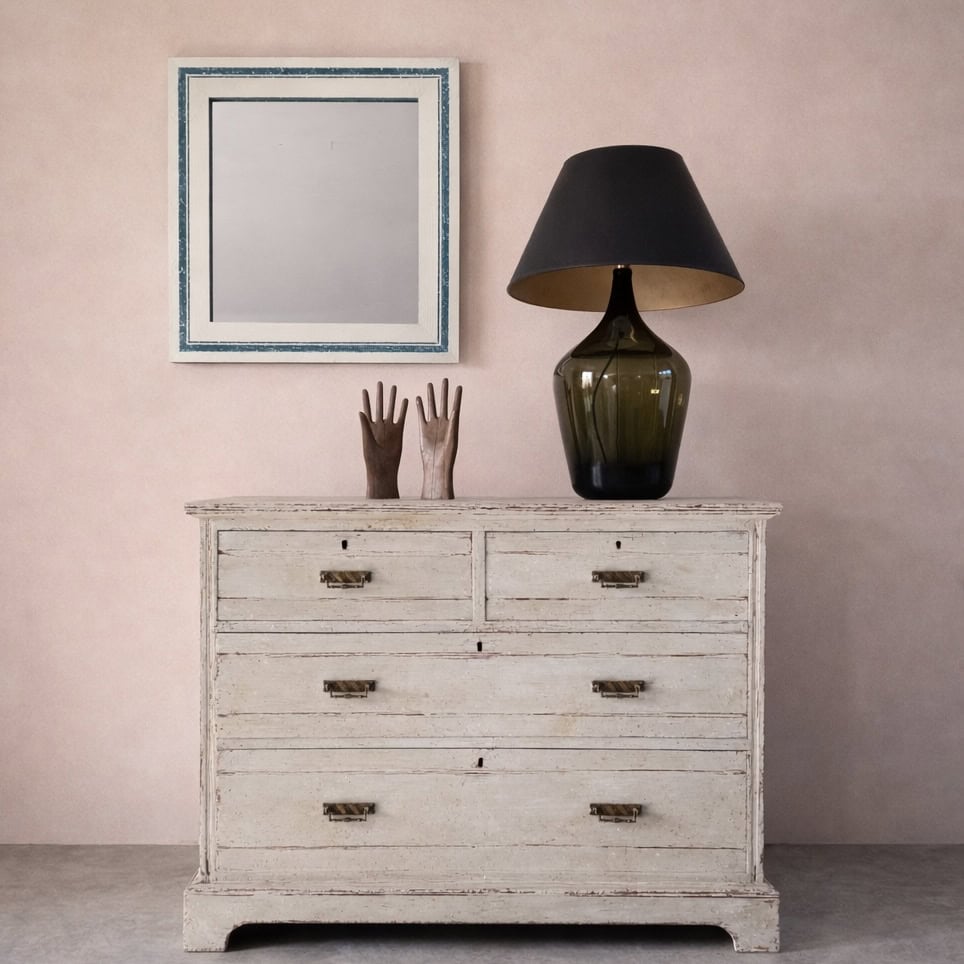 Each mirror is handmade by Archie in his workshop in the Cotswolds and individually finished using layered paints to create depth, texture and character, with subtle variations in tone and distressing.