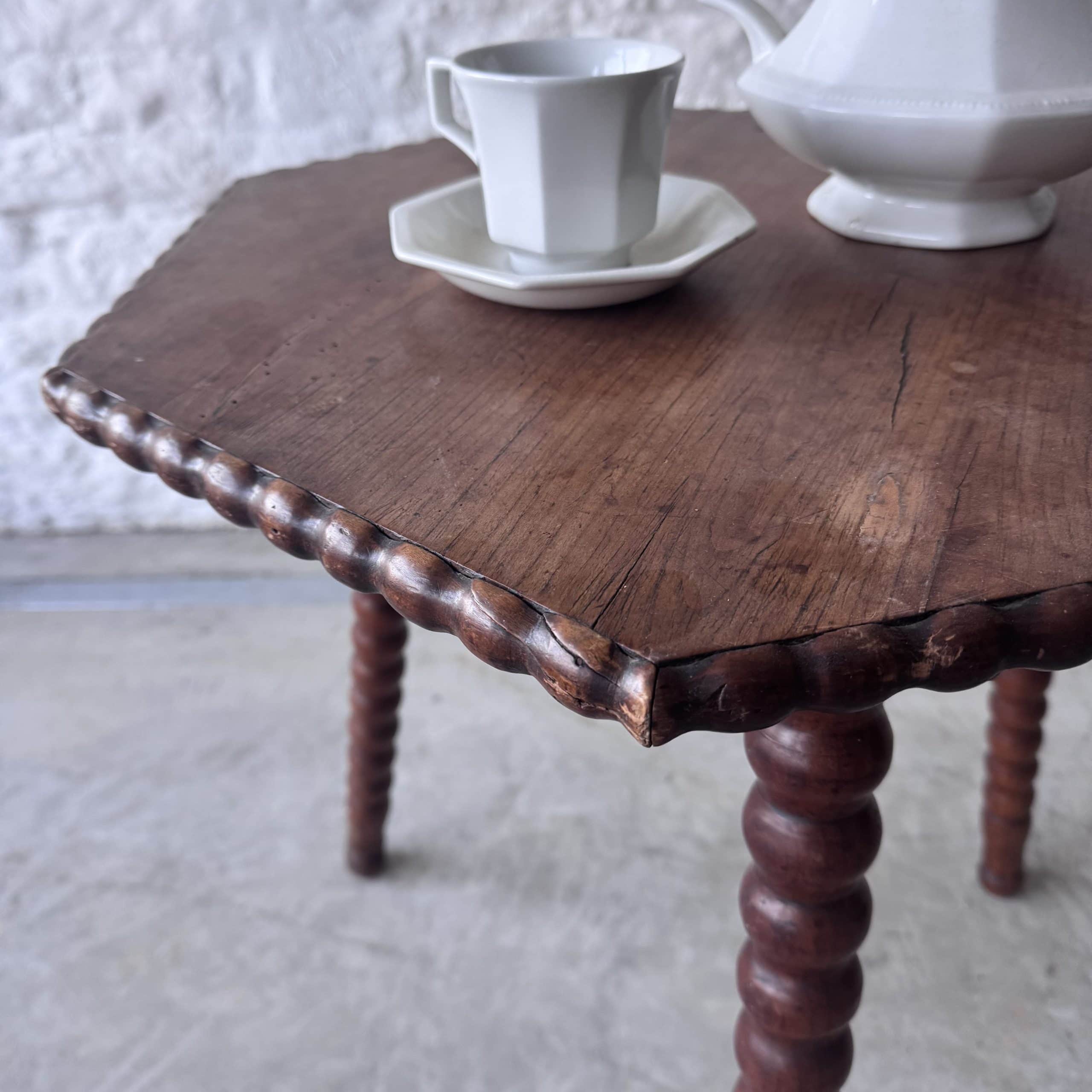 Sourced in North East Spain this useful side table is 19th Century with turned fruitwood legs with inlaid hexagonal top.