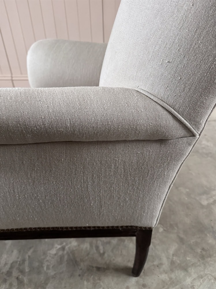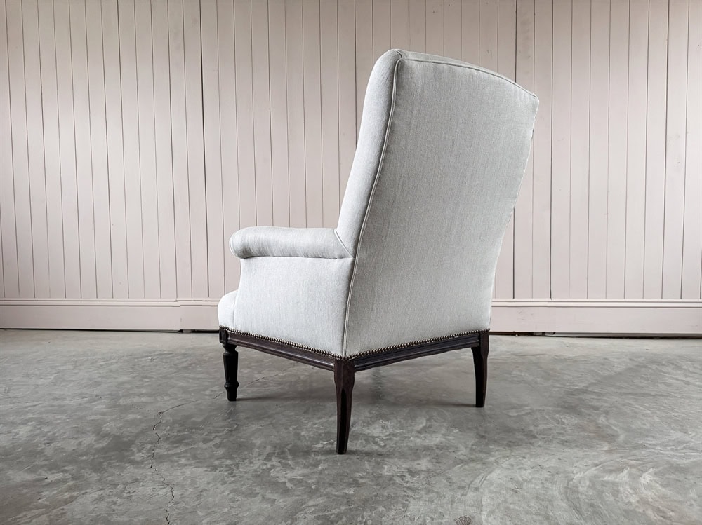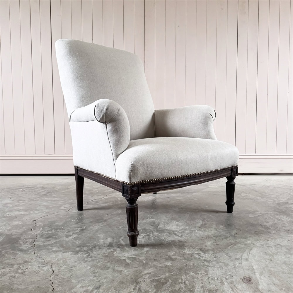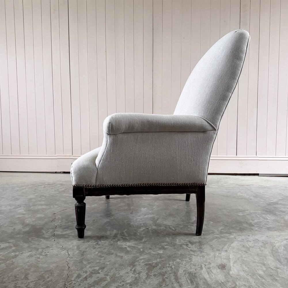 Late 19th Century Napoleon III French Armchair. Upholstered in a soft grey linen.