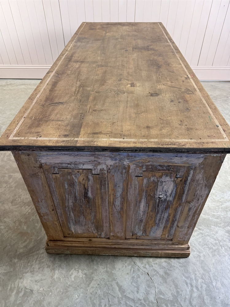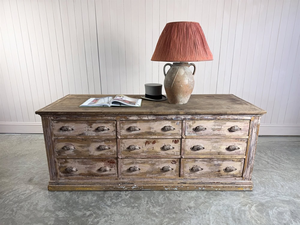 This unusual double sided antique bank of drawers was sourced from a haberdashery shop in Limoges, France. Late 19th Century with fantastic original paint and lovely details and handles.