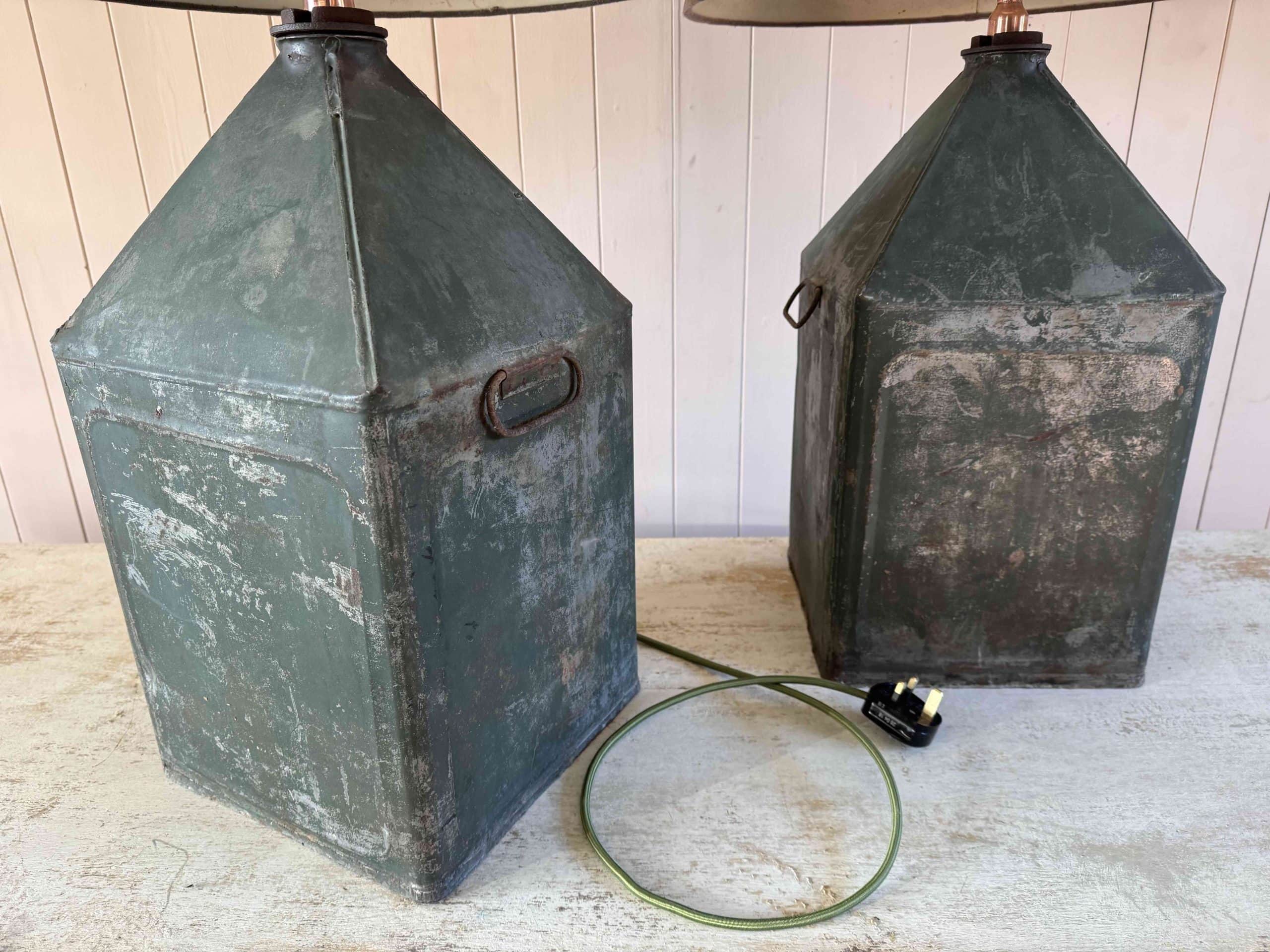 These decorative tabled lamps have been re-purposed by converting these 1920's English oil canisters.