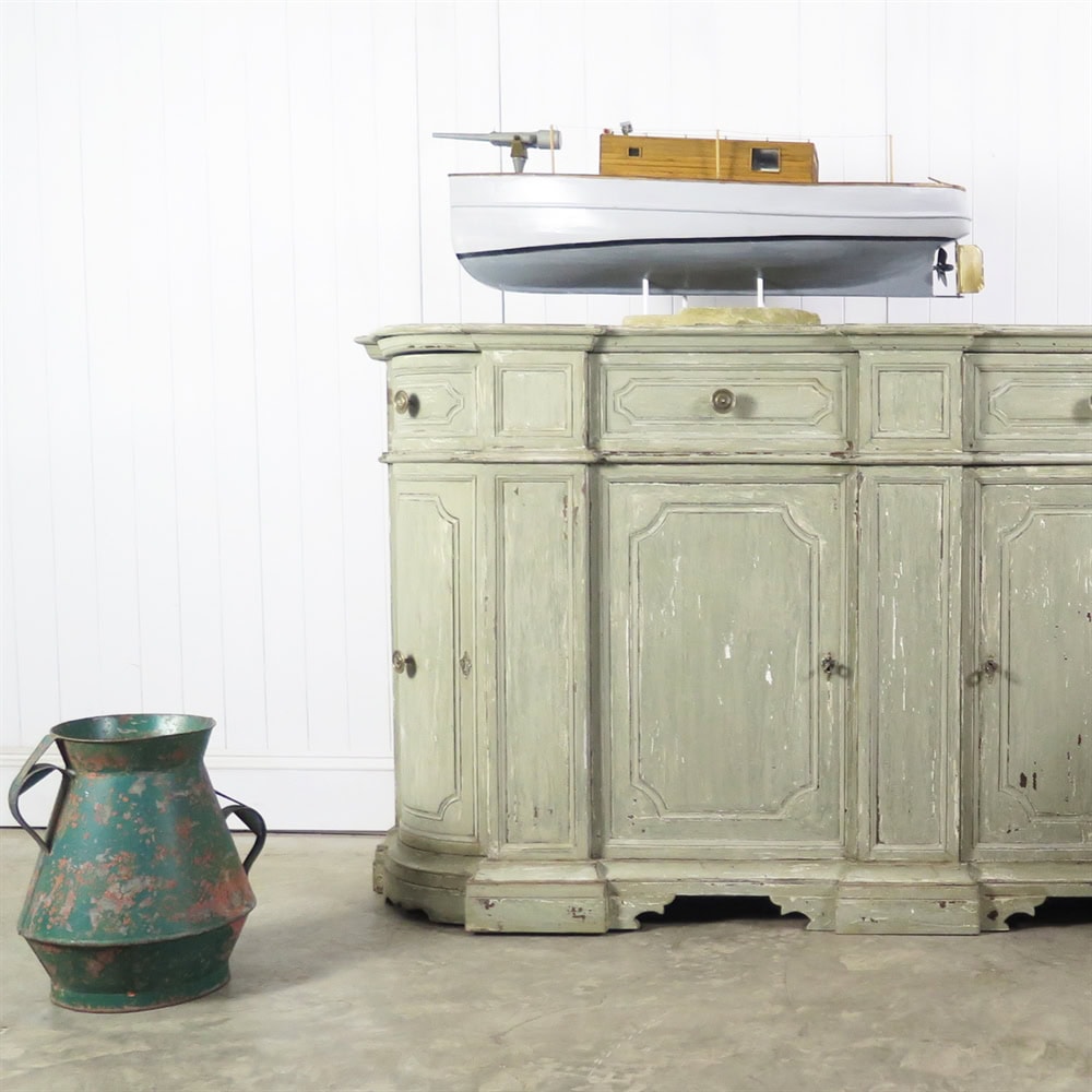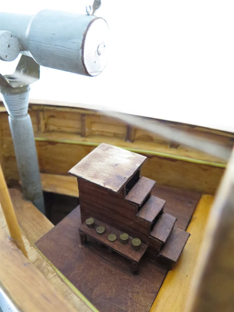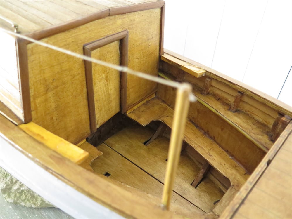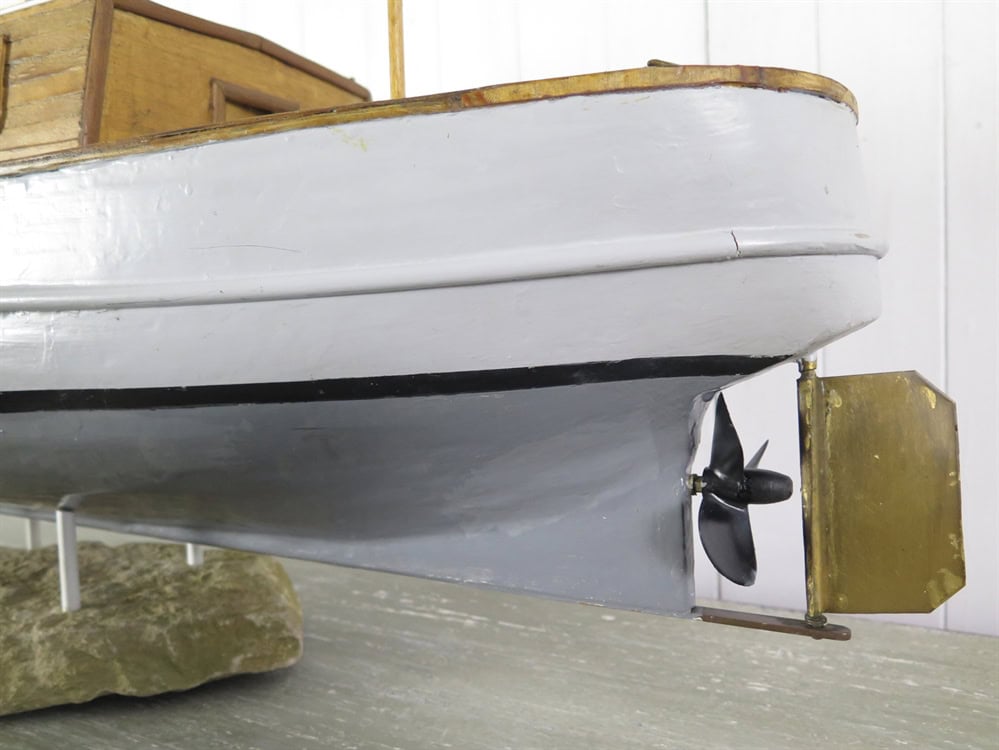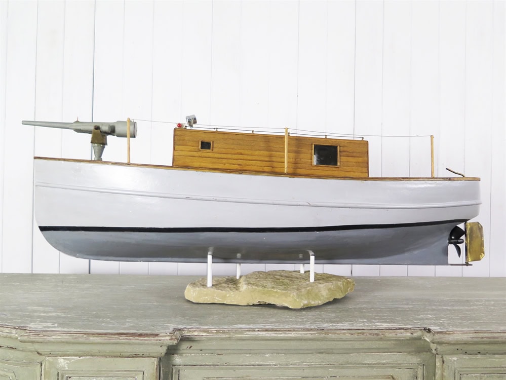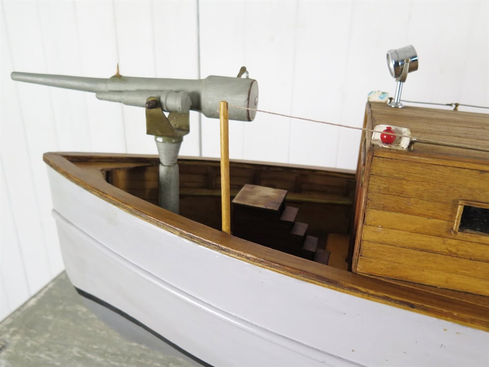 We believe this wooden model boat to be circa 1960s/70s, judging by the materials used.