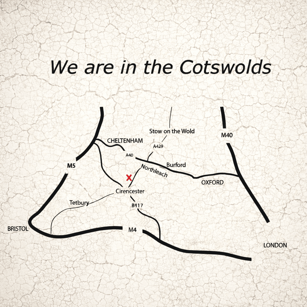 In Gloucestershire just 5 miles North of Cirencester on an old farm in the middle of a beautiful hamlet called Calmsden.