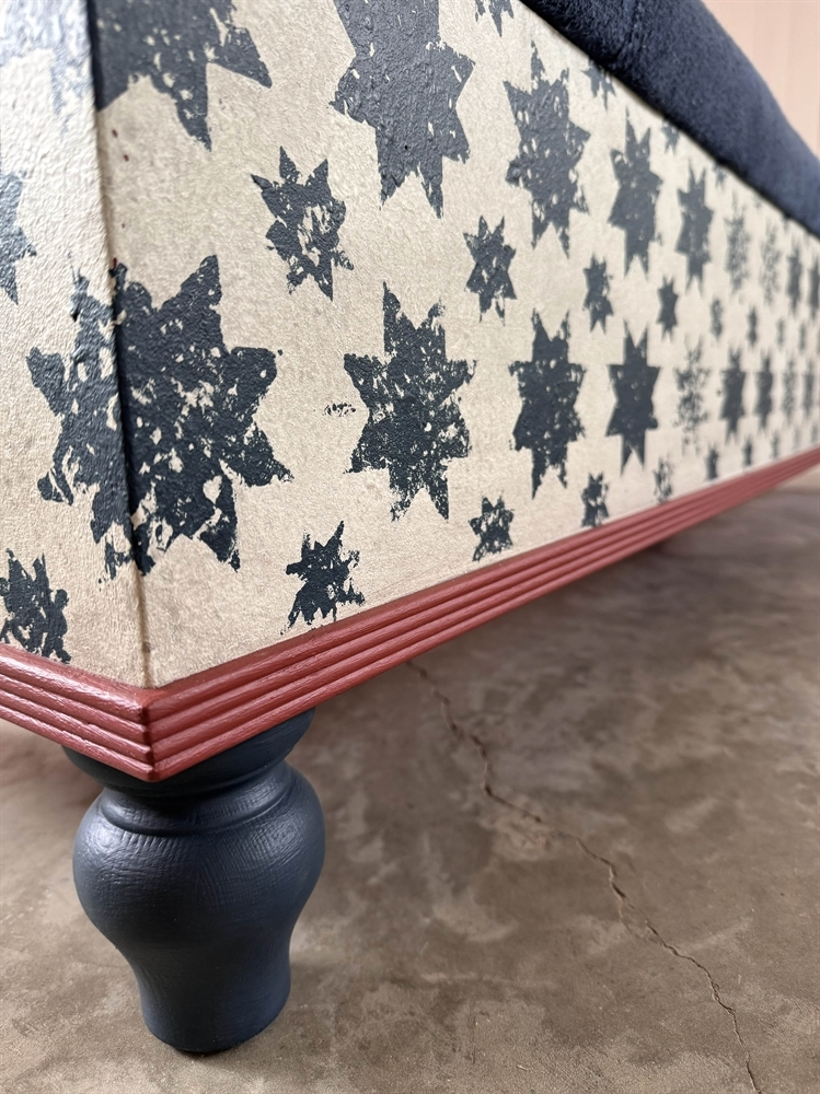 Made from solid timbers and painted using many layers of colours and upholstered in a heavyweight antique Italian linen. We even used the patch !