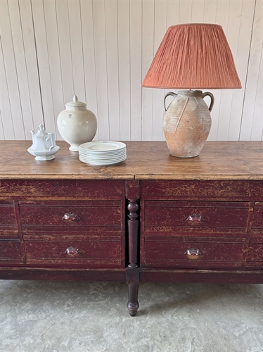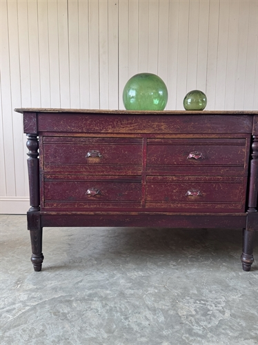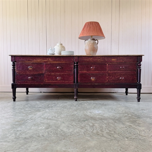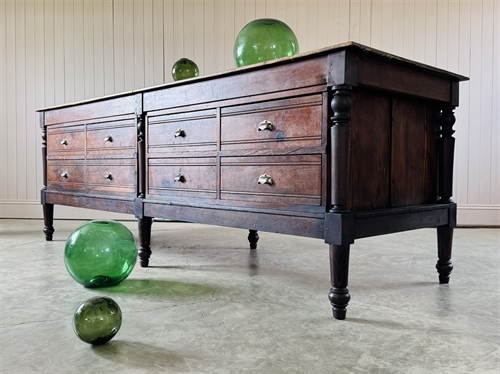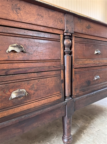 I had a client in mind who had been looking for an interesting island to add intrigue to her very smart painted kitchen units. She loved this and the fact that the drawers opened on either side. We had new legs turned to bring this up to standard island height and she is replacing the top with a contrasting marble surface.