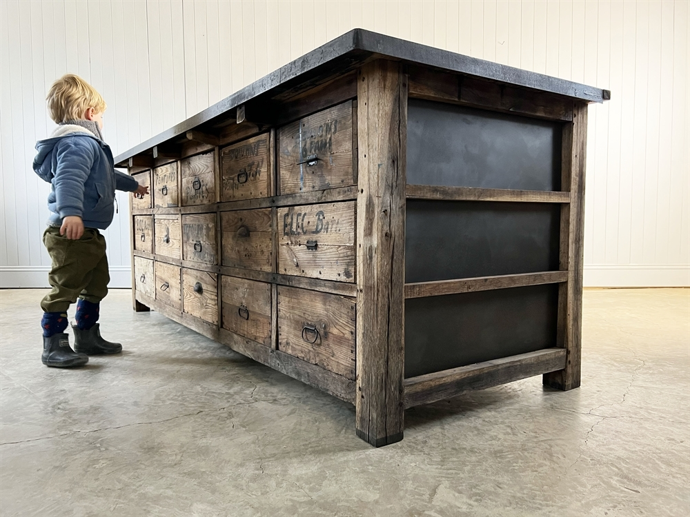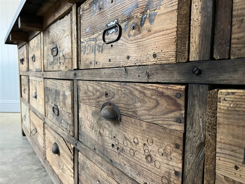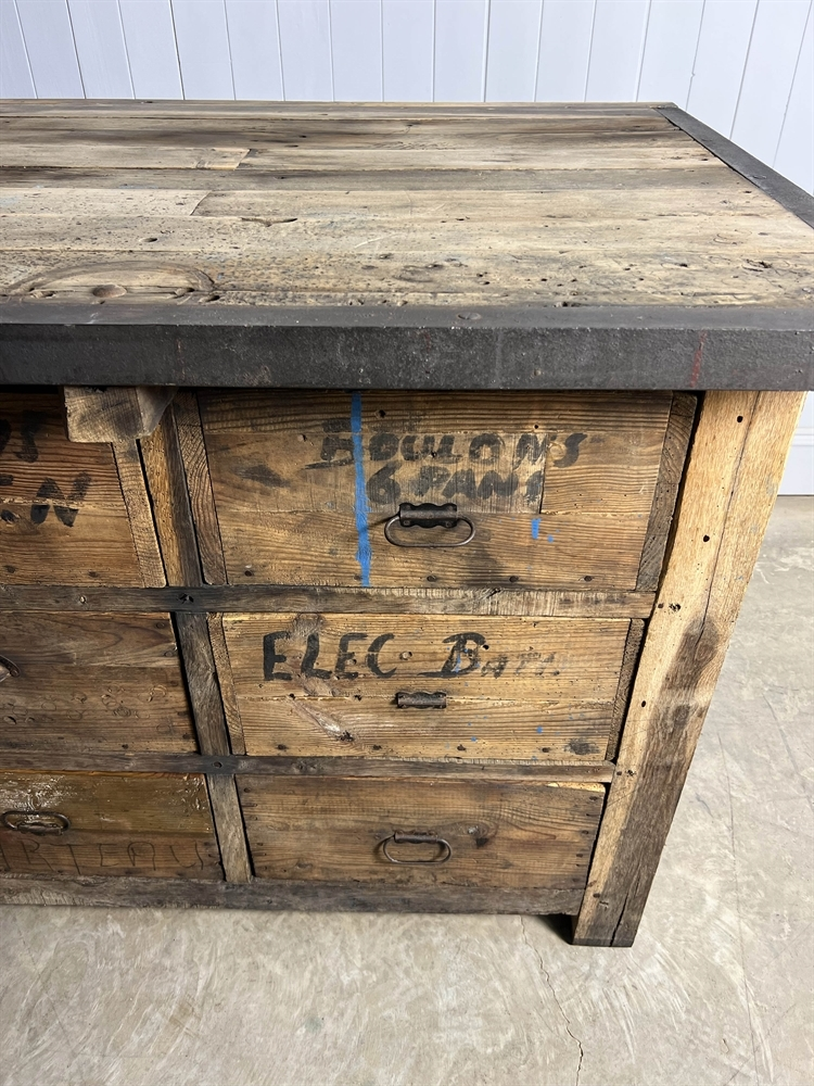 This is a very heavy superb piece of vintage industrial furniture with masses of character, patina etc. Please note that it has very noticeable signs of old wood worm which we have thoroughly re-treated to be on the safe side. The worm does not effect the stability of the piece at all as it is so robust, the drawers being over an inch thick ...
