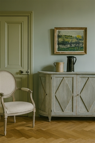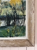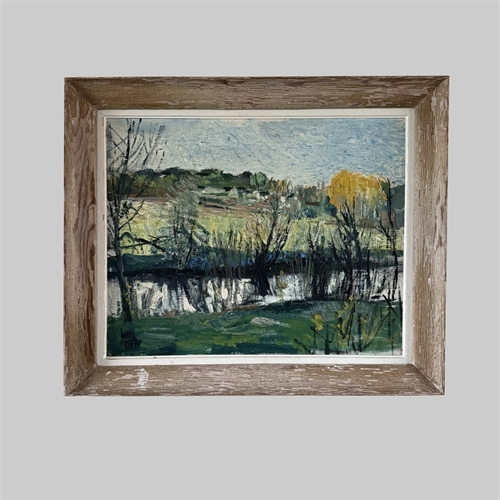 Great texture to this Mid-Century oil on canvas painting depicting a serene French countryside landscape with a river and distant hills.