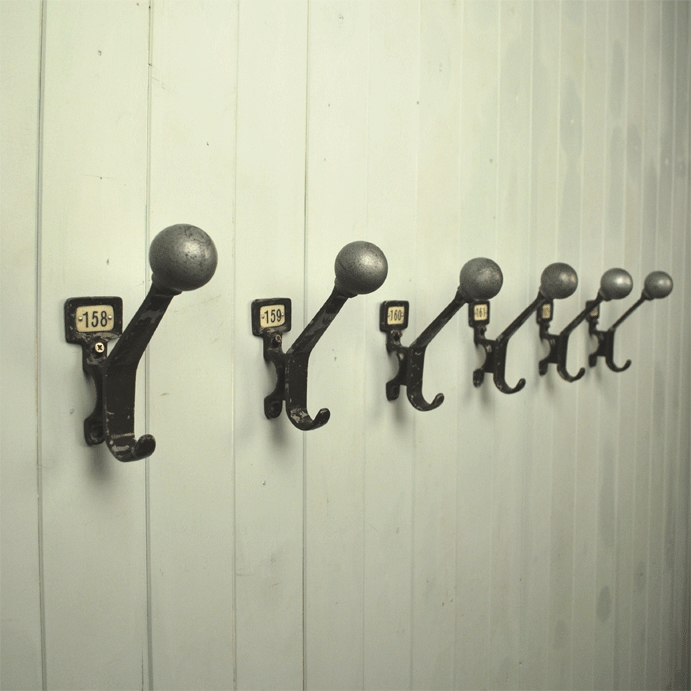 The hooks are painted cast aluminium and were originally fitted either side of a pole in a changing room, although they can easily be mounted on a wall. Quite hard to see from the pictures but the colour of the paint is actually brown, and is flaking in places.