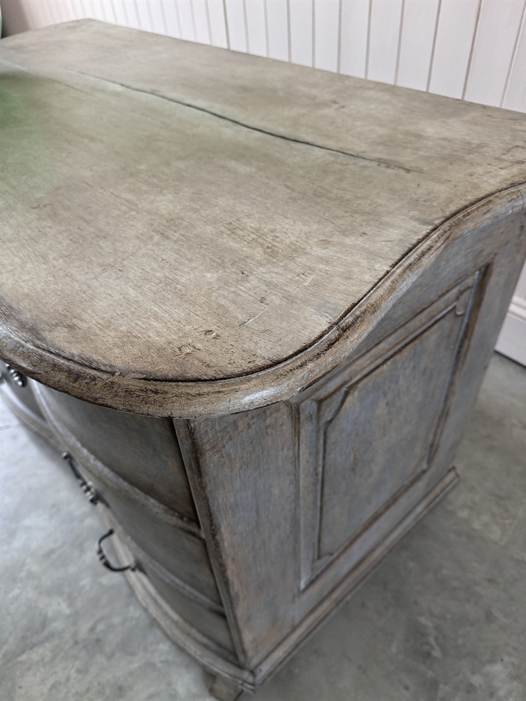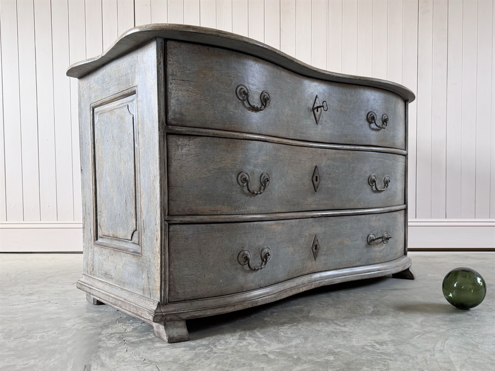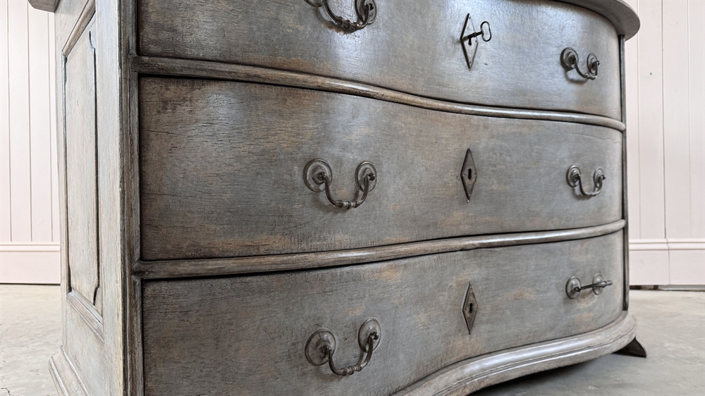 This is a striking example of an 18th Century French chest of drawers which features a classic serpentine front and retains its original soft grey paint.