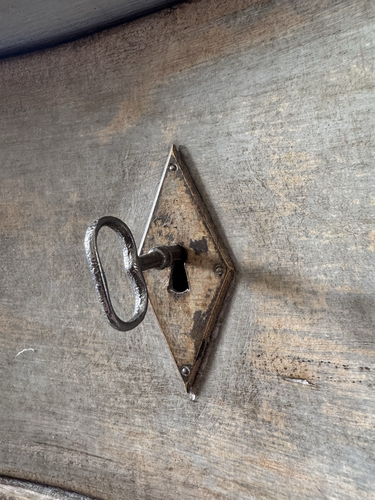 Classic craftsmanship of the period and the original grey paint reveals a patina that speaks to centuries of history and use. The piece has been re-varnished to seal in the natural patina.