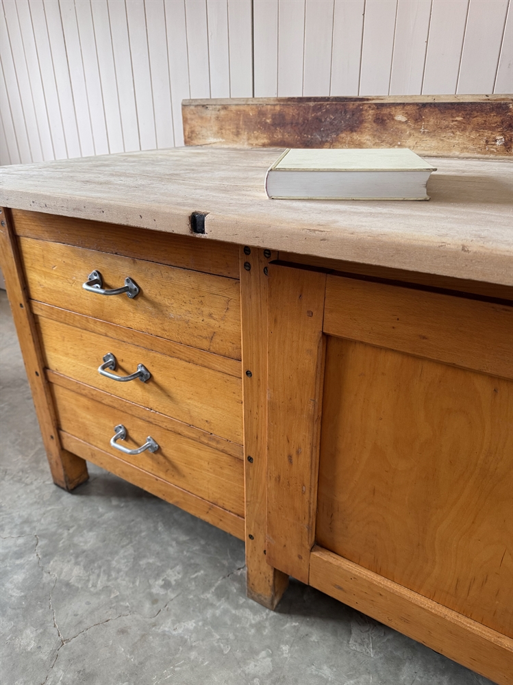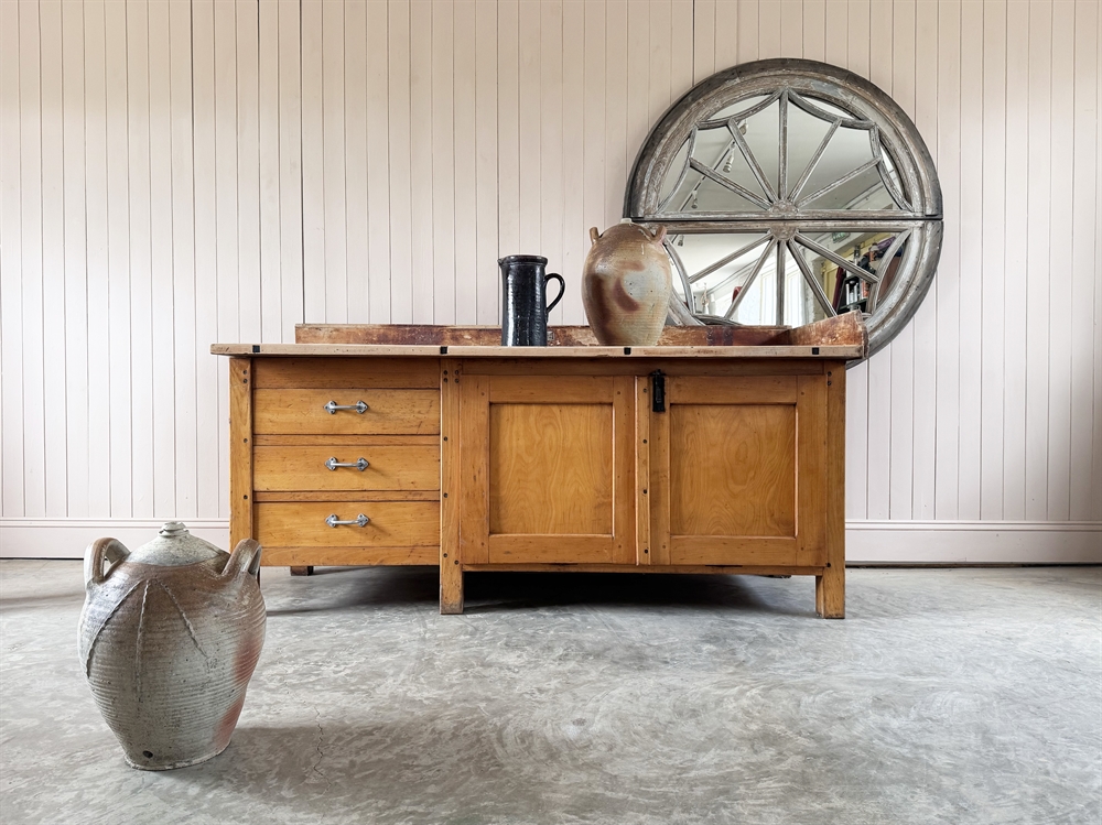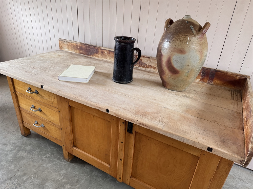 Sourced in Belgium this classic bakery counter is made predominantly from beech with a beautifully worn sycamore top.