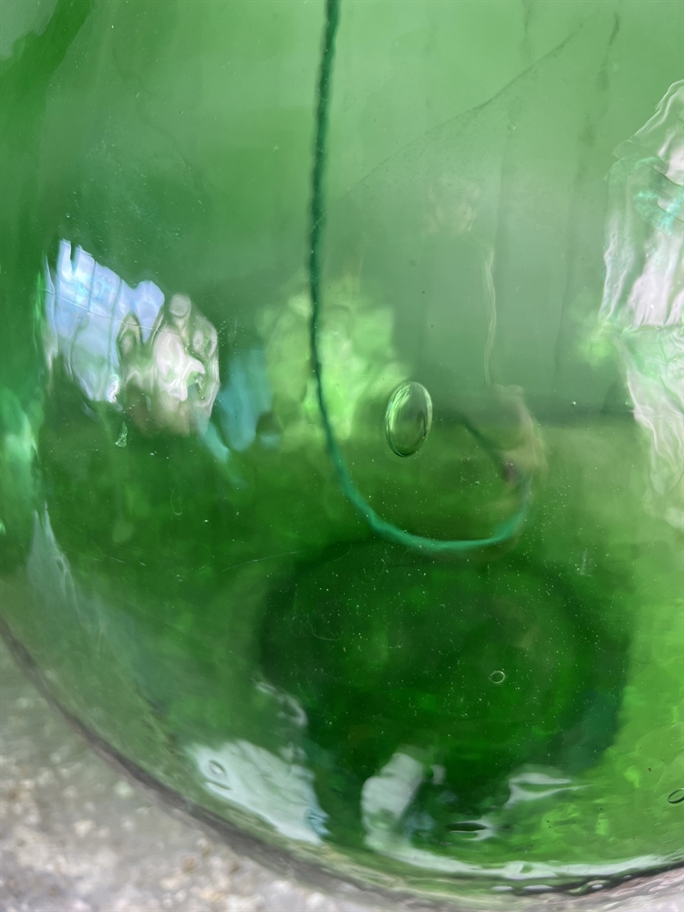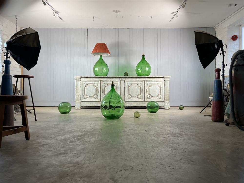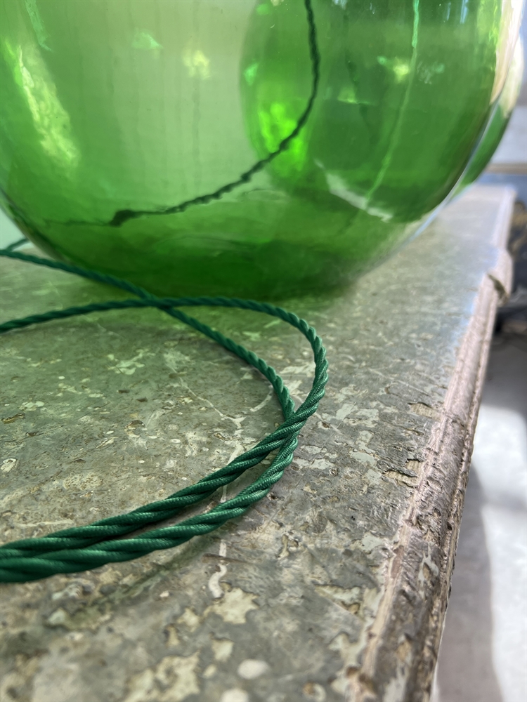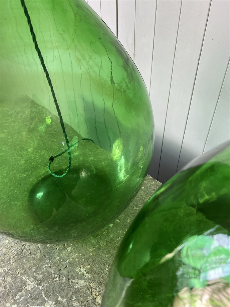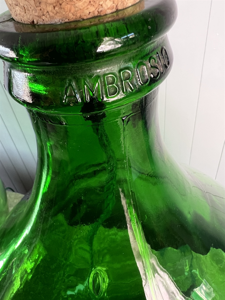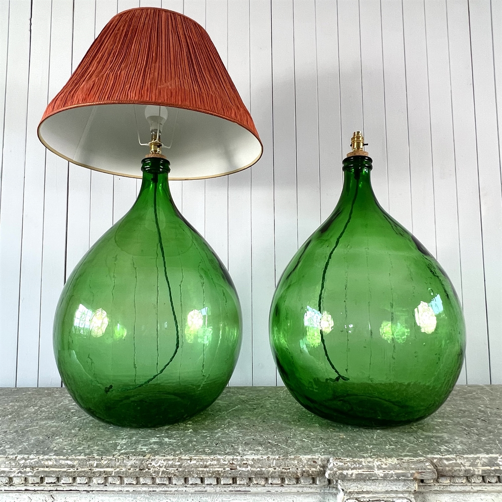 These giant Italian bottles are early 20th Century. We have converted them into bottle lamps using green braided flex and brass bulb holders.
