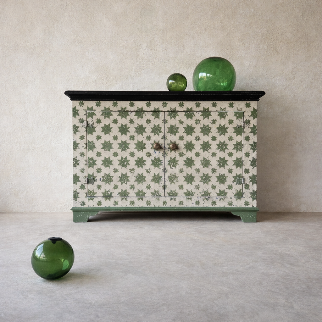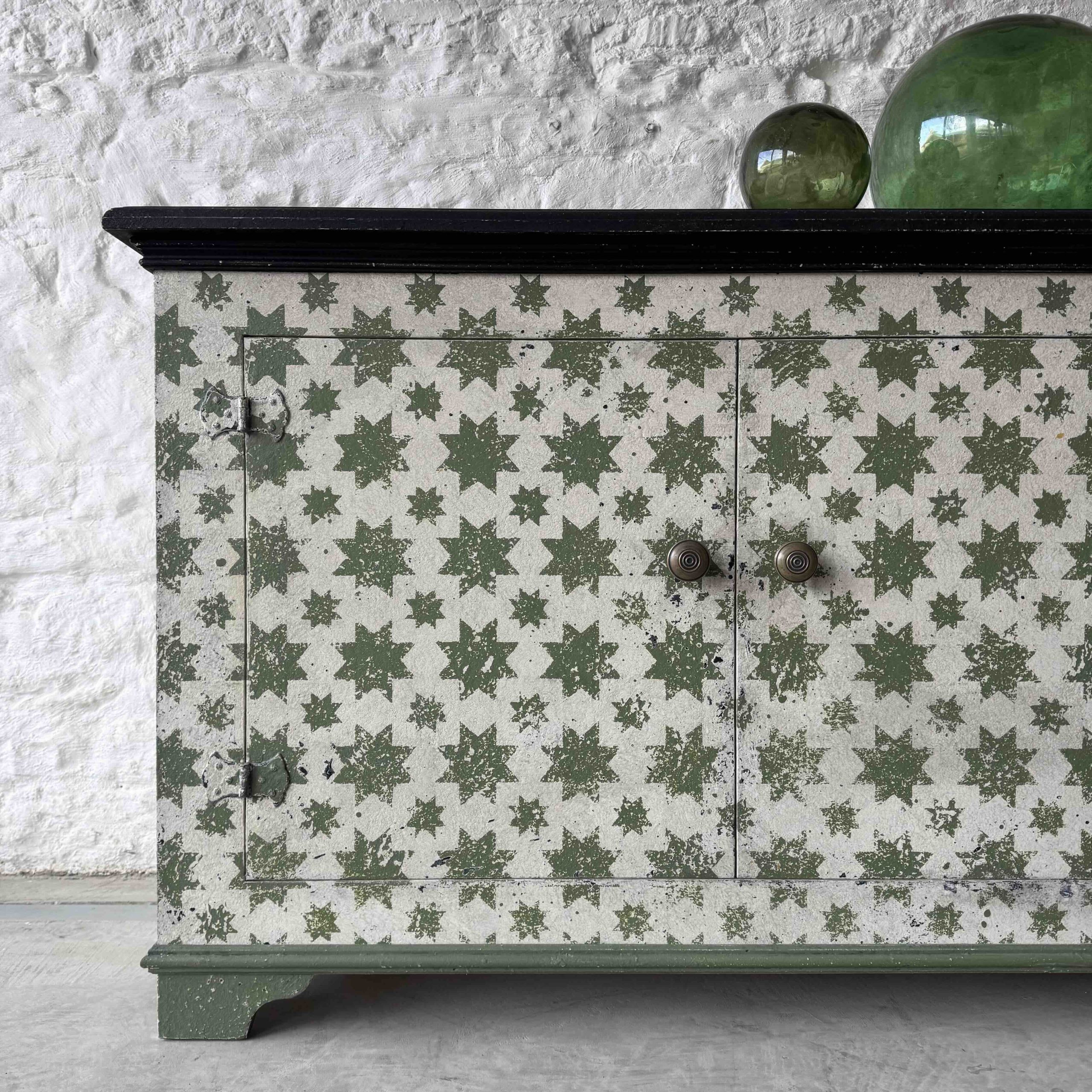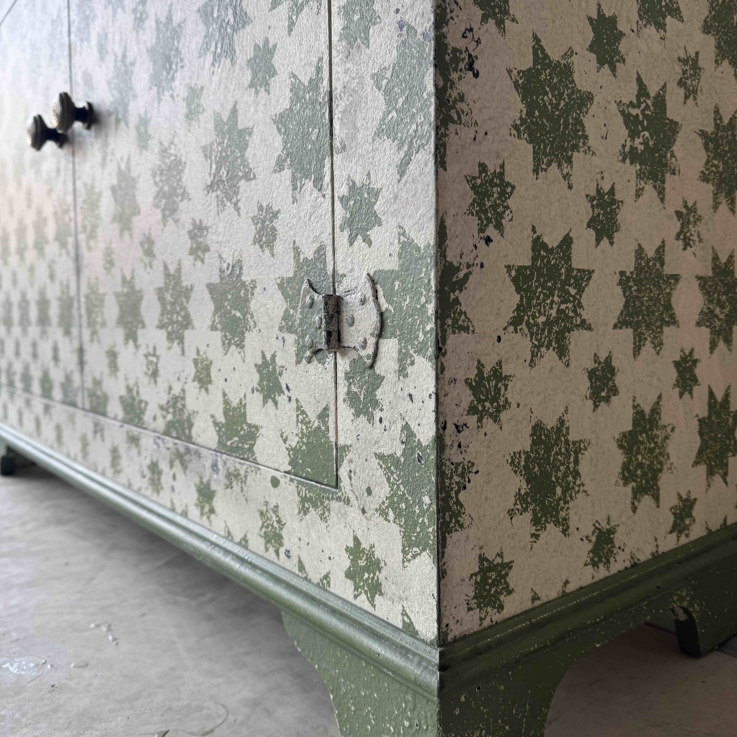 Based on an Italian decorative pattern, the Calke Green Stars sideboard is handmade locally in the Cotswolds and painted in-house.