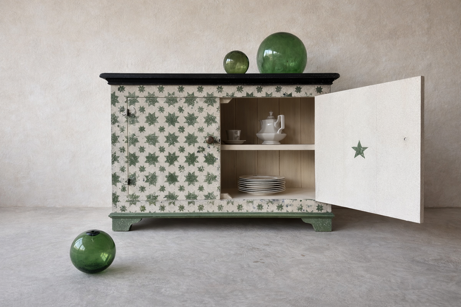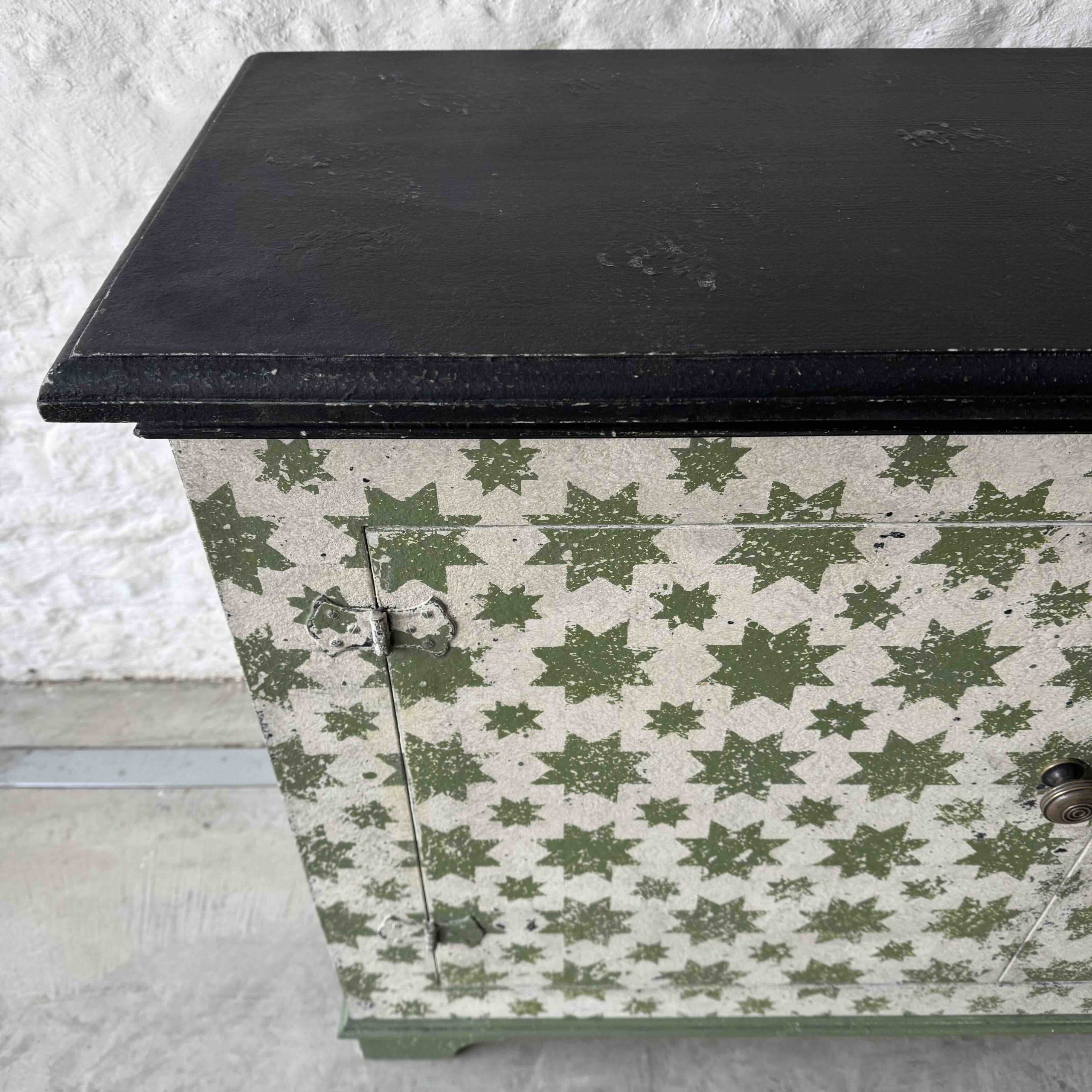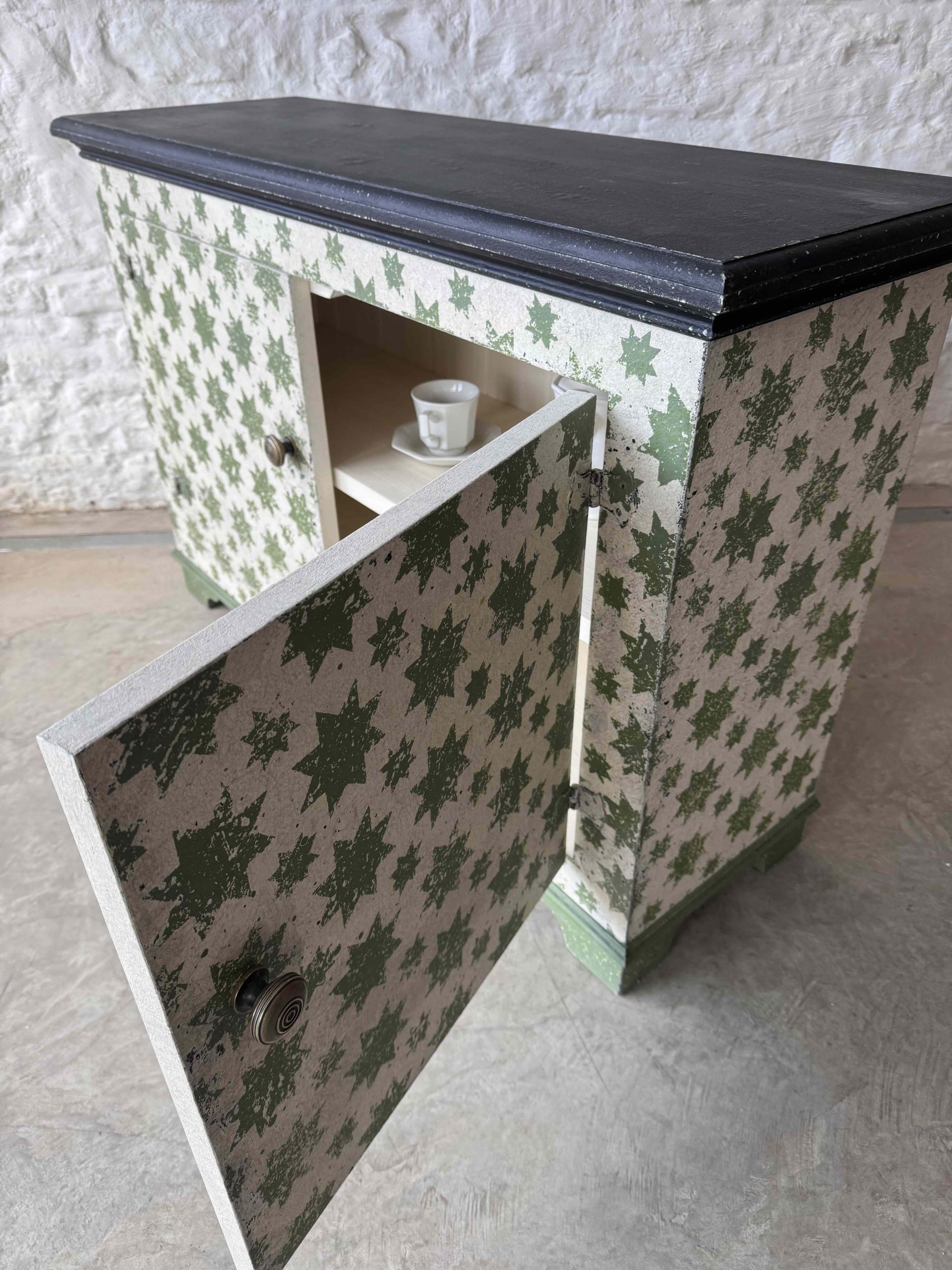 Based on an Italian decorative pattern, the Calke Green Stars sideboard is handmade locally in the Cotswolds and painted in-house.