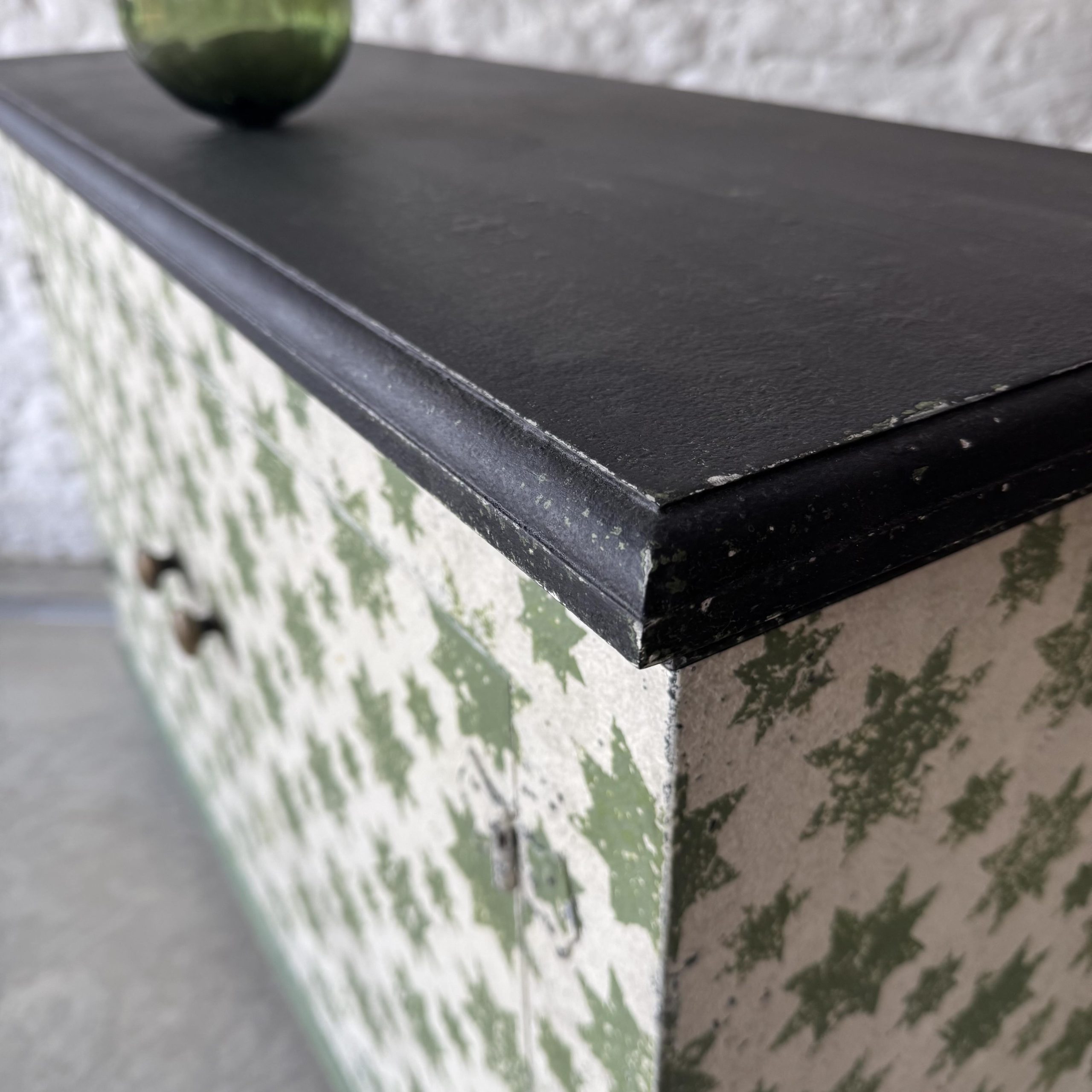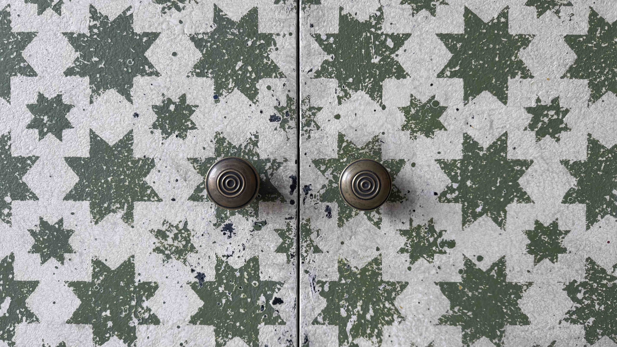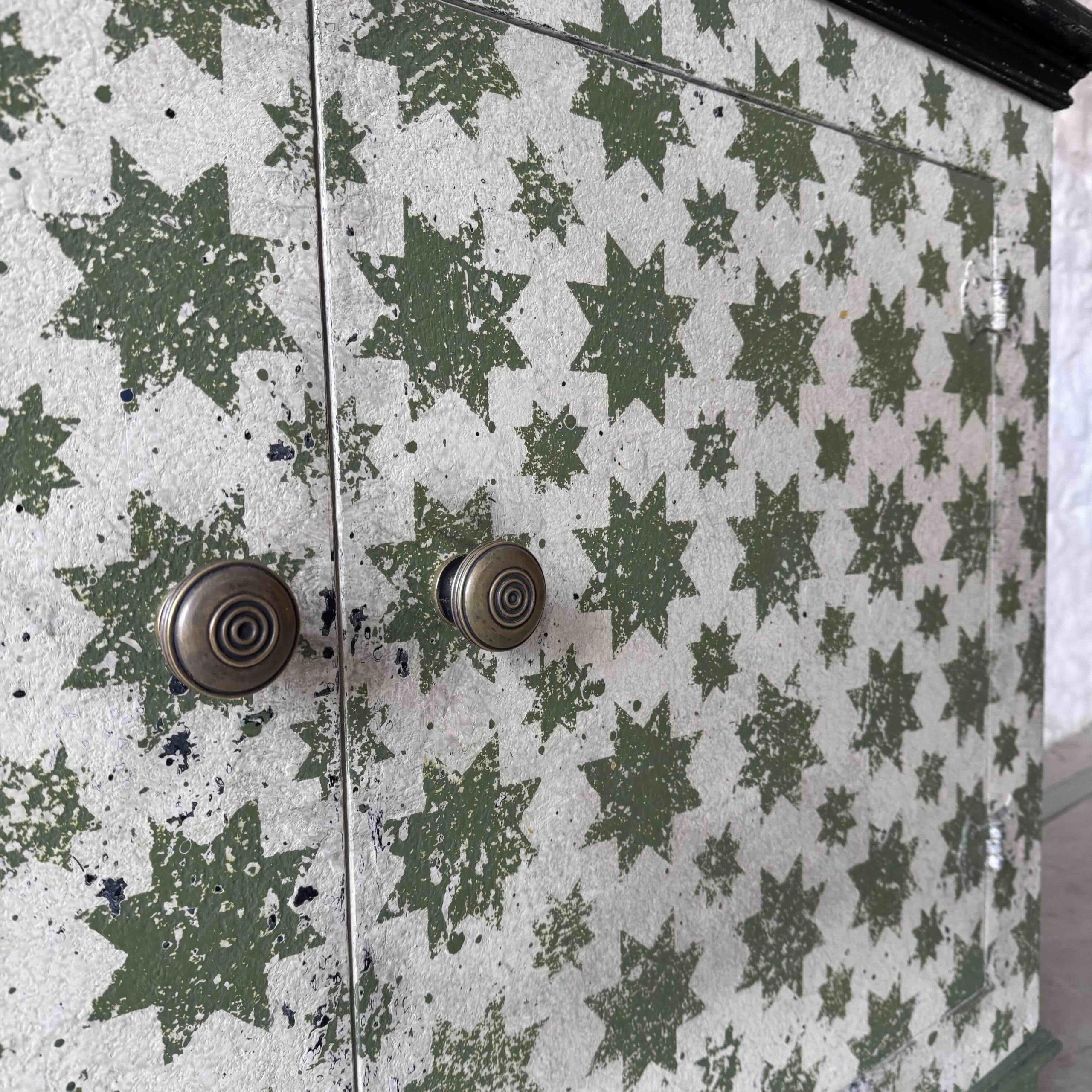 The green star pattern is Calke Green by Farrow and Ball – with lots of other colours coming through the many layers of paint.