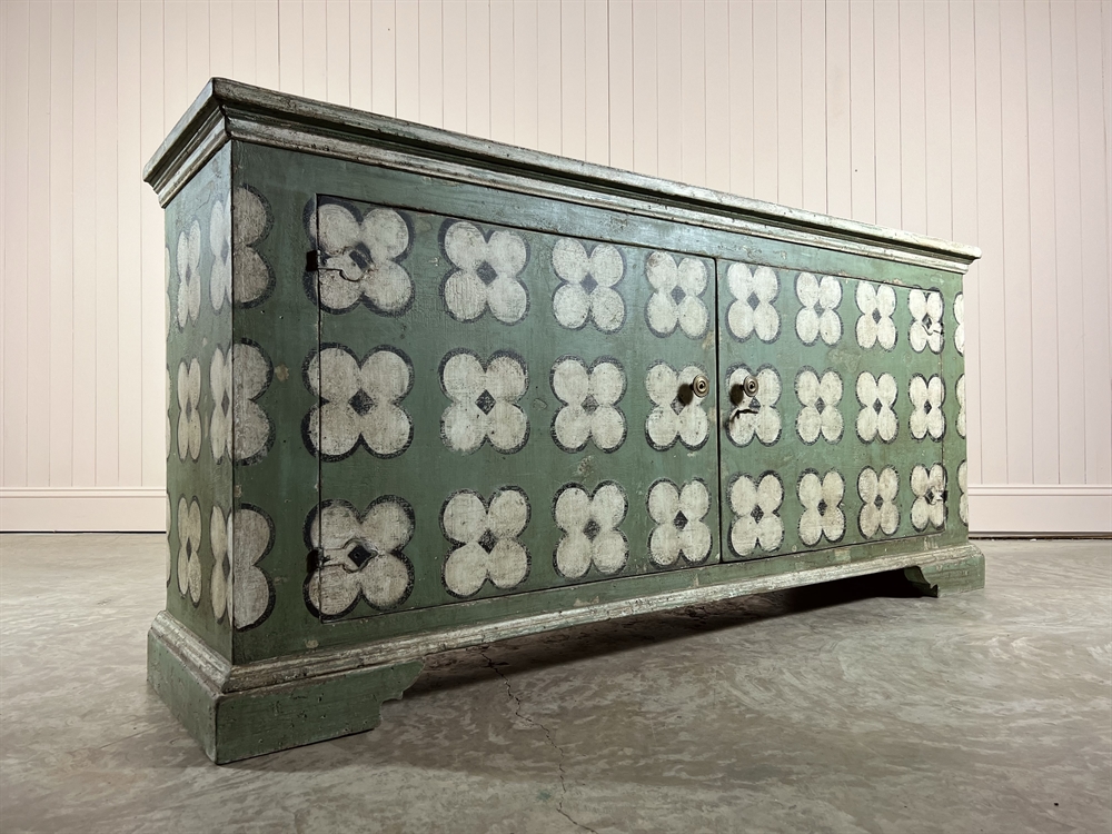 This decorative chevron painted sideboard was a commission. Painted in Bancha Green by Farrow and Ball. This client wanted this with hardly any patina / distressing.
