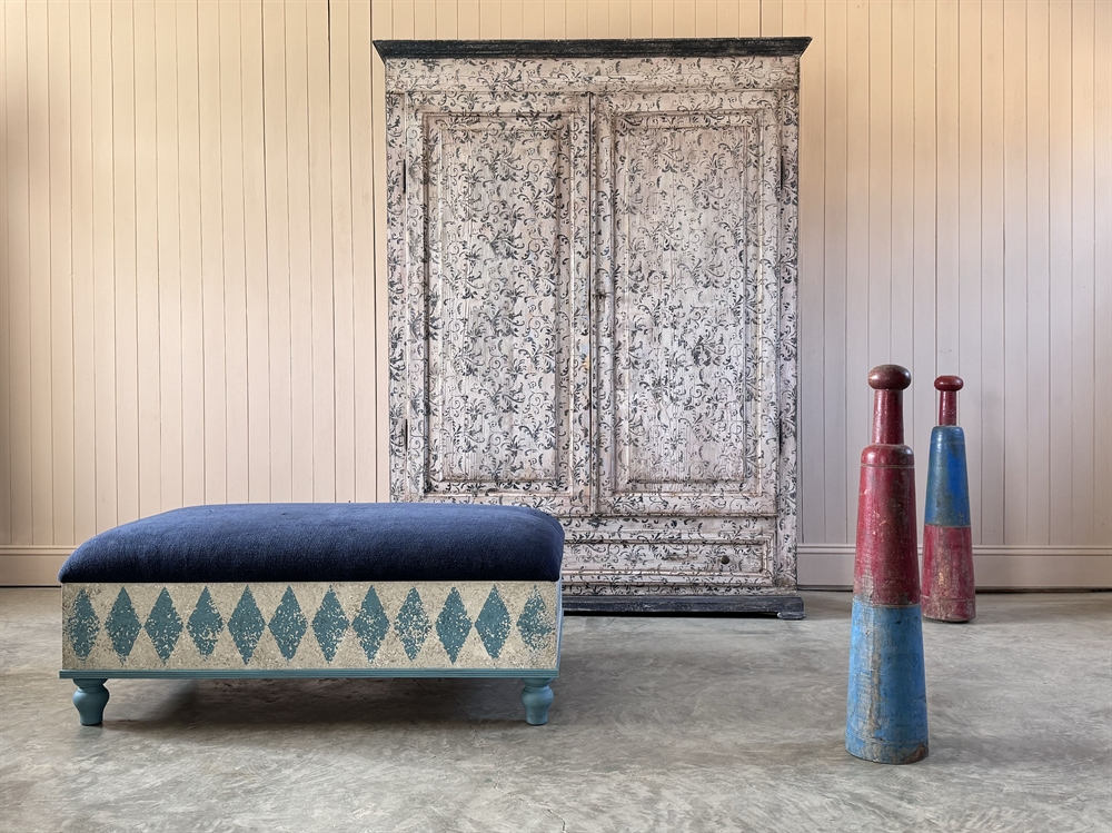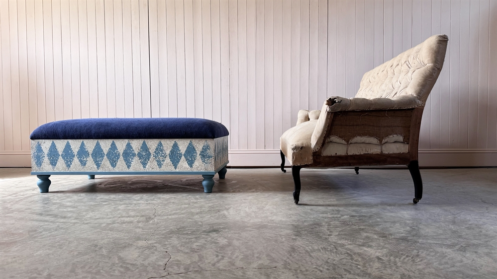 The inspiration for these bespoke footstools came from an antique Italian Ottoman which we bought and sold with a similar construction.