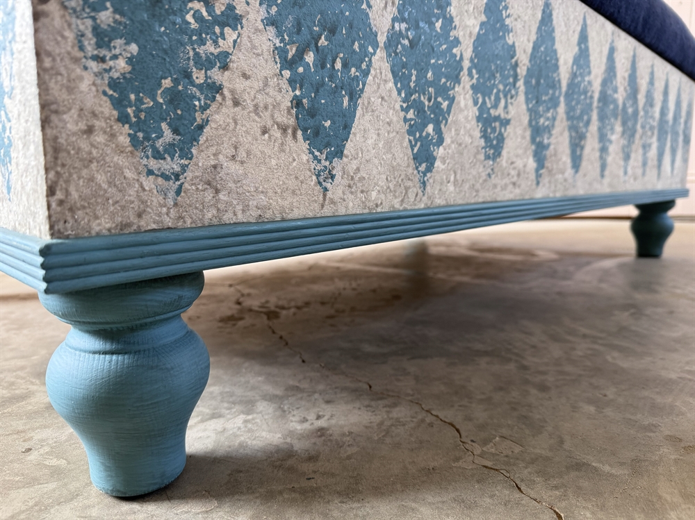 Made from Tulip wood and ply with turned pine feet, decoratively painted using many layers of colours. The blue here is 2052-40 (Benjamin Moore). The paint is then sealed with a diamond hard matt varnish. Upholstered with a vintage Hungarian very heavy linen.
