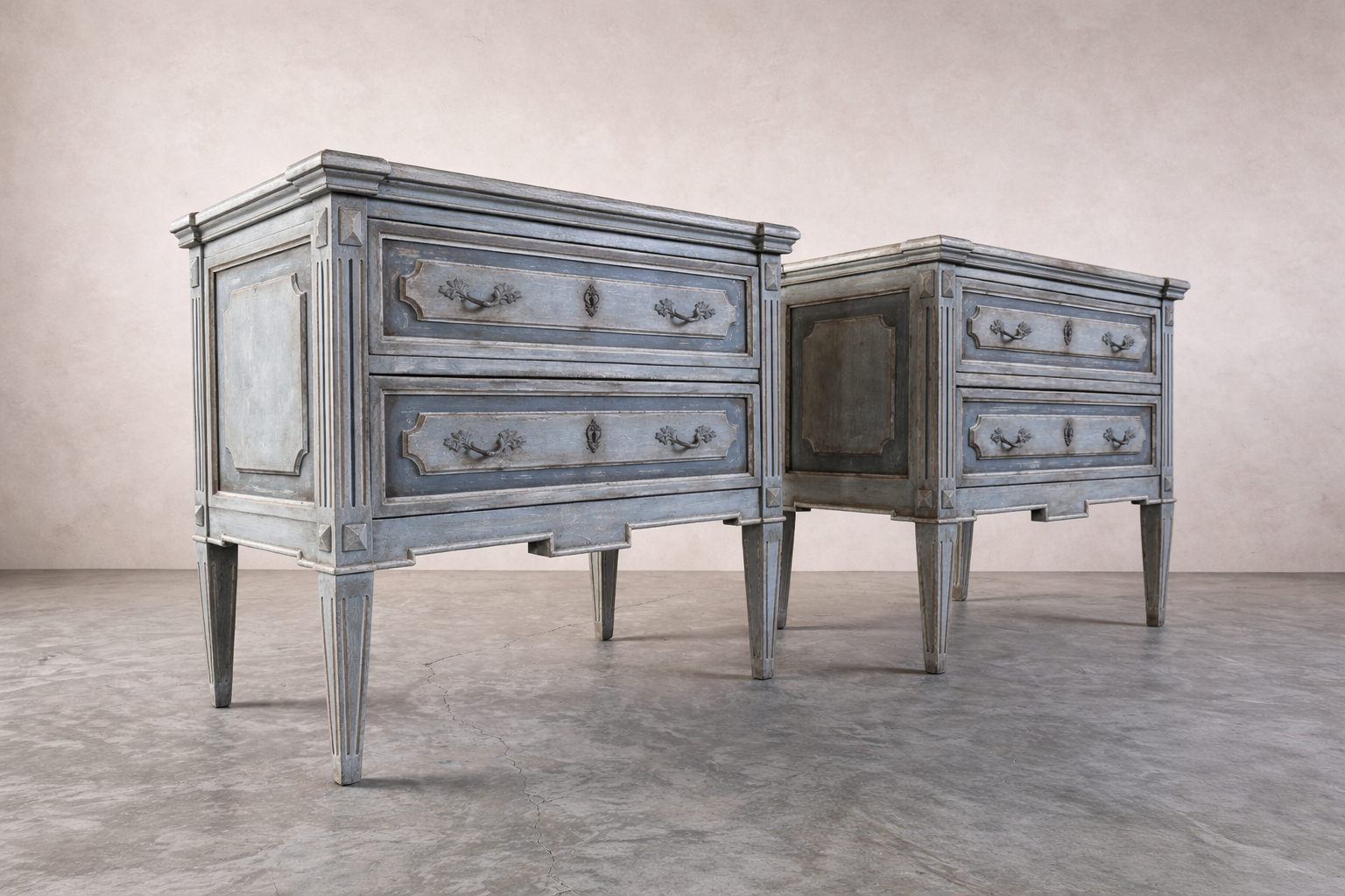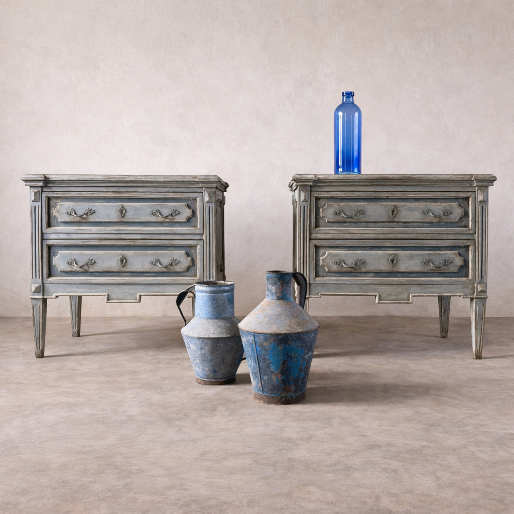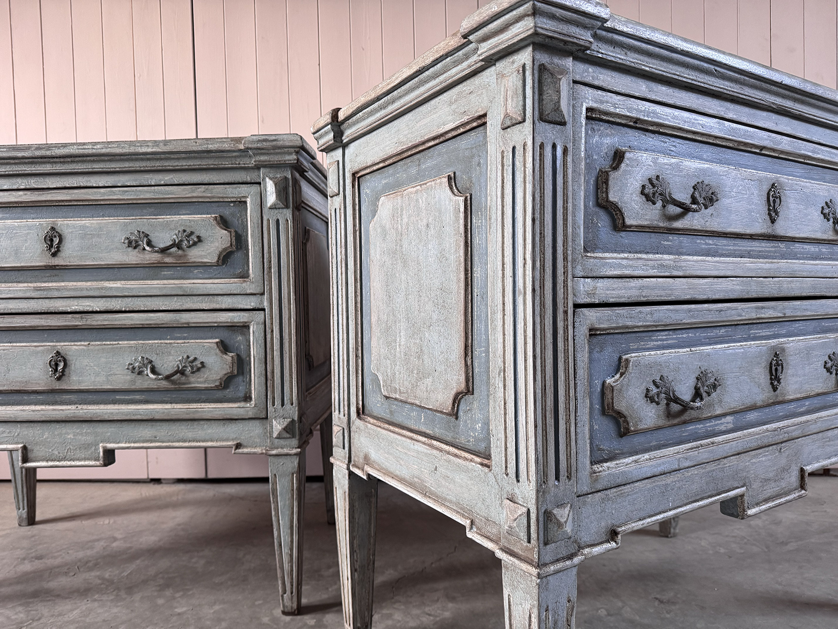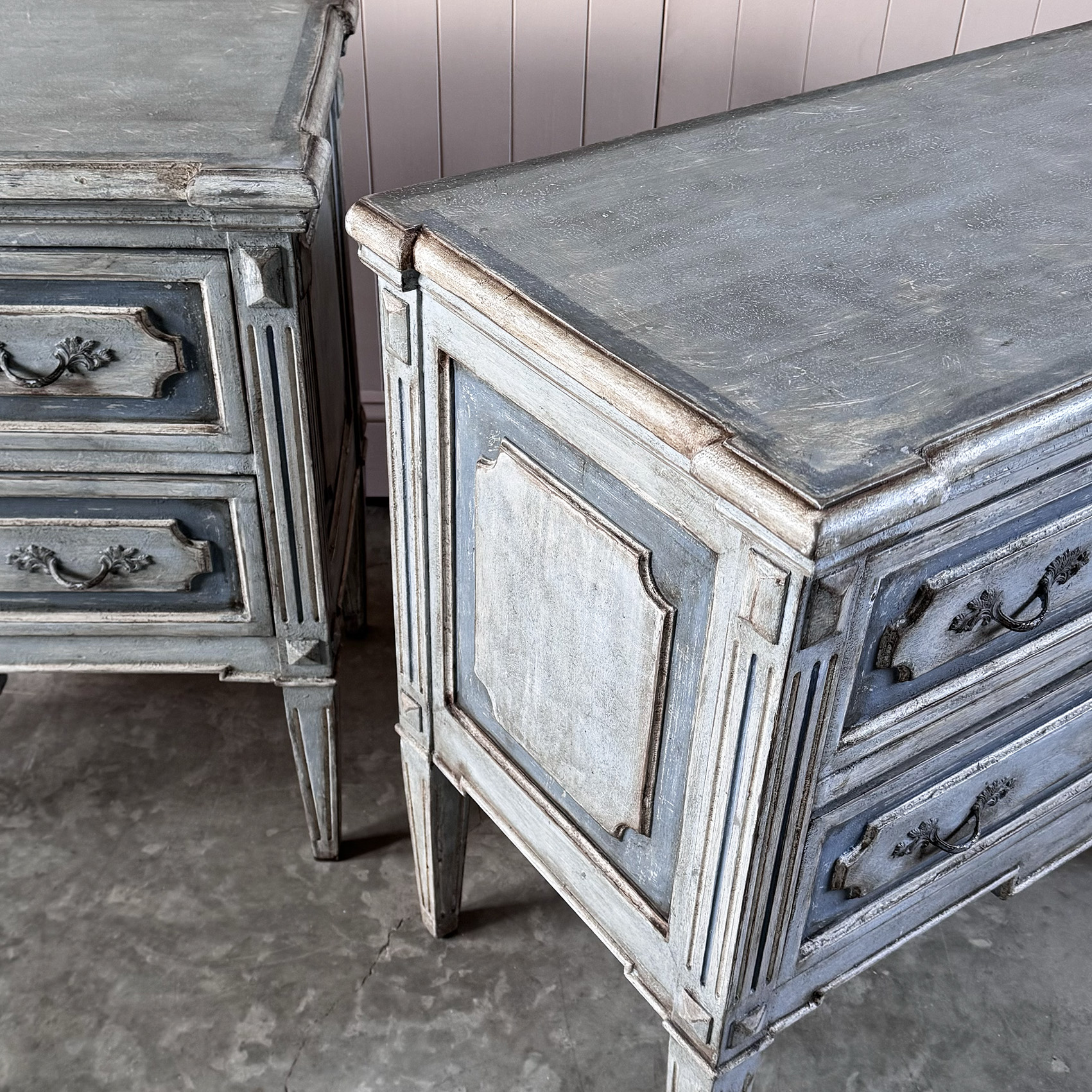 Elegant pair of Italian 19th century bedside tables, newly painted in a soft, understated finish, blues and greys, that complements their original proportions and carved details.