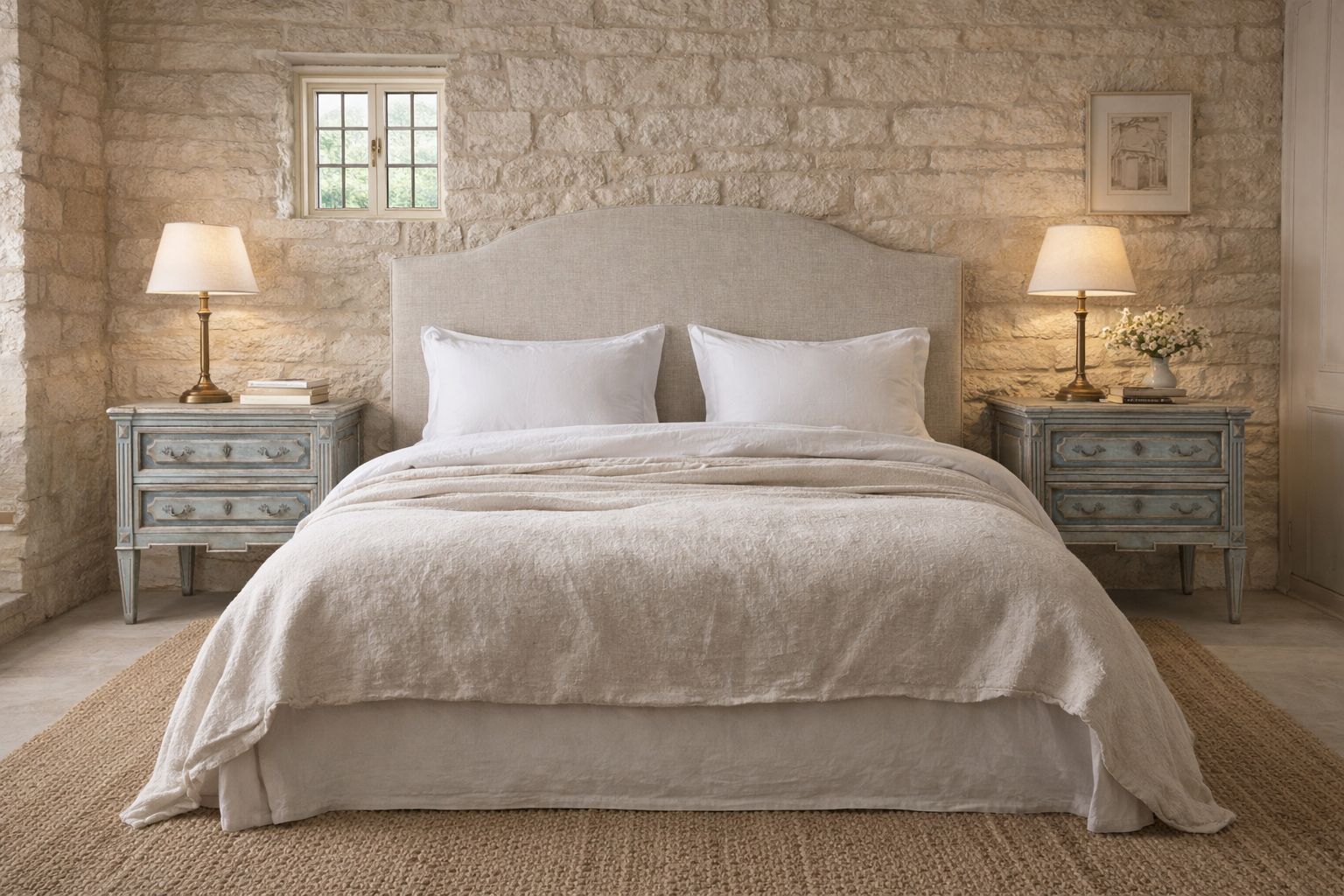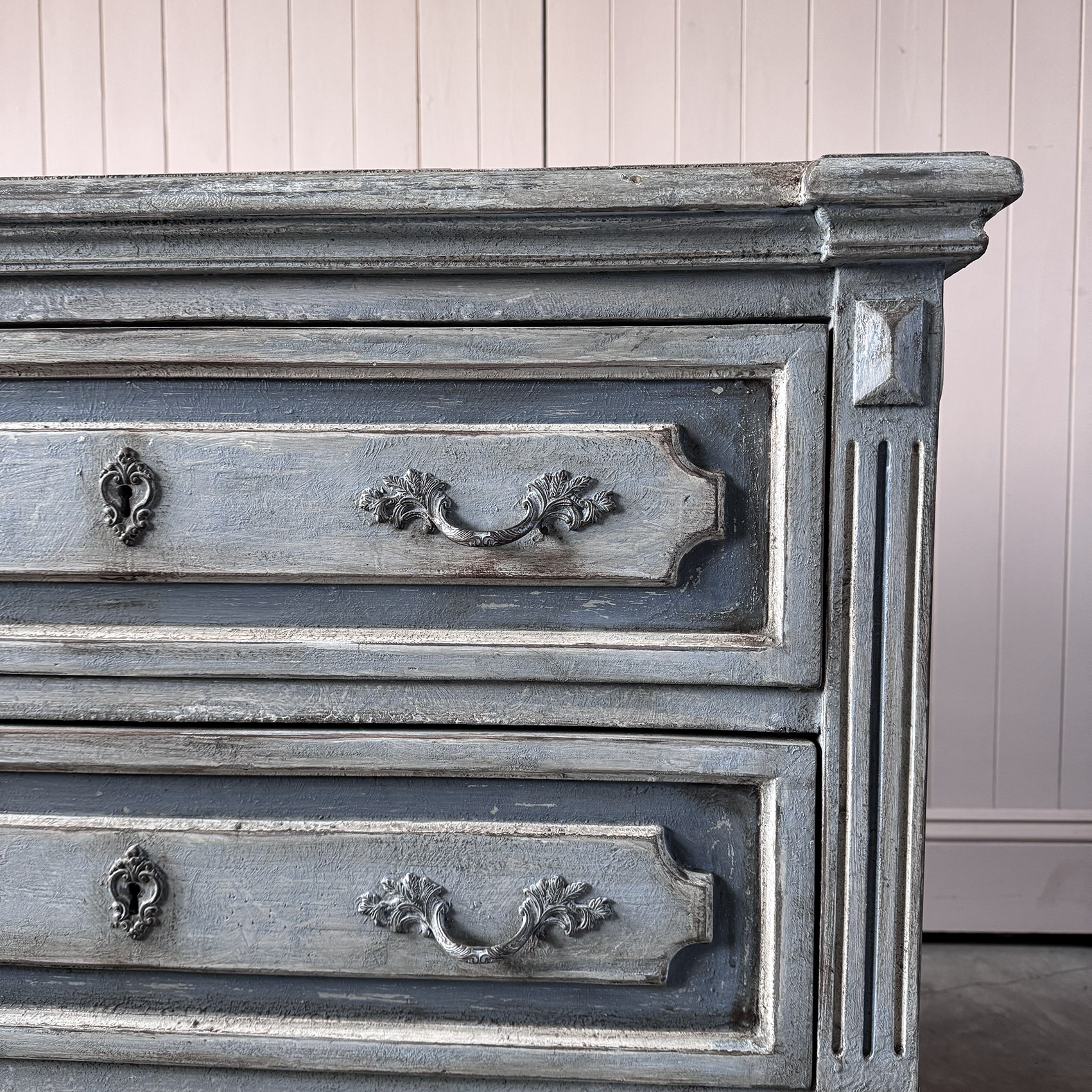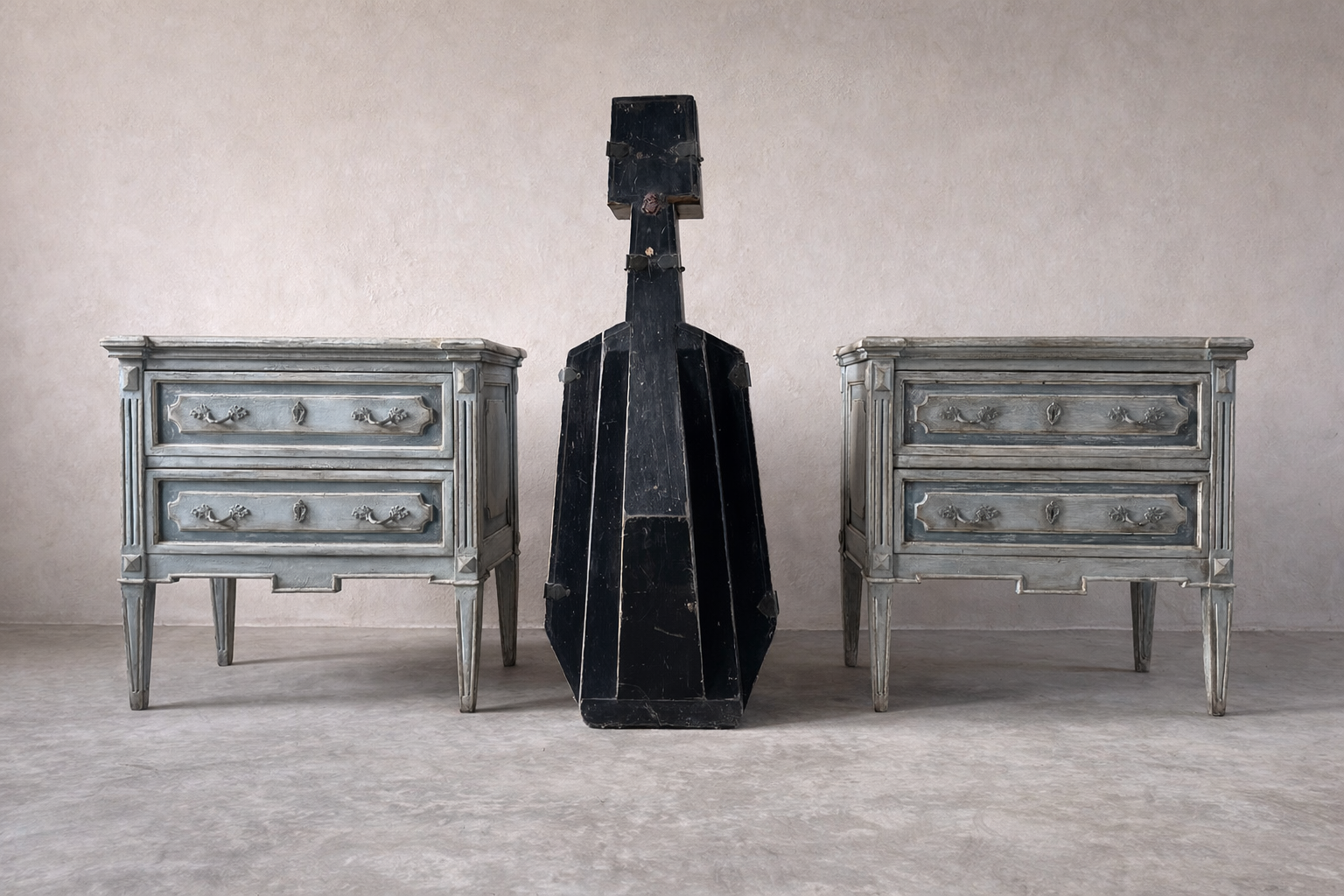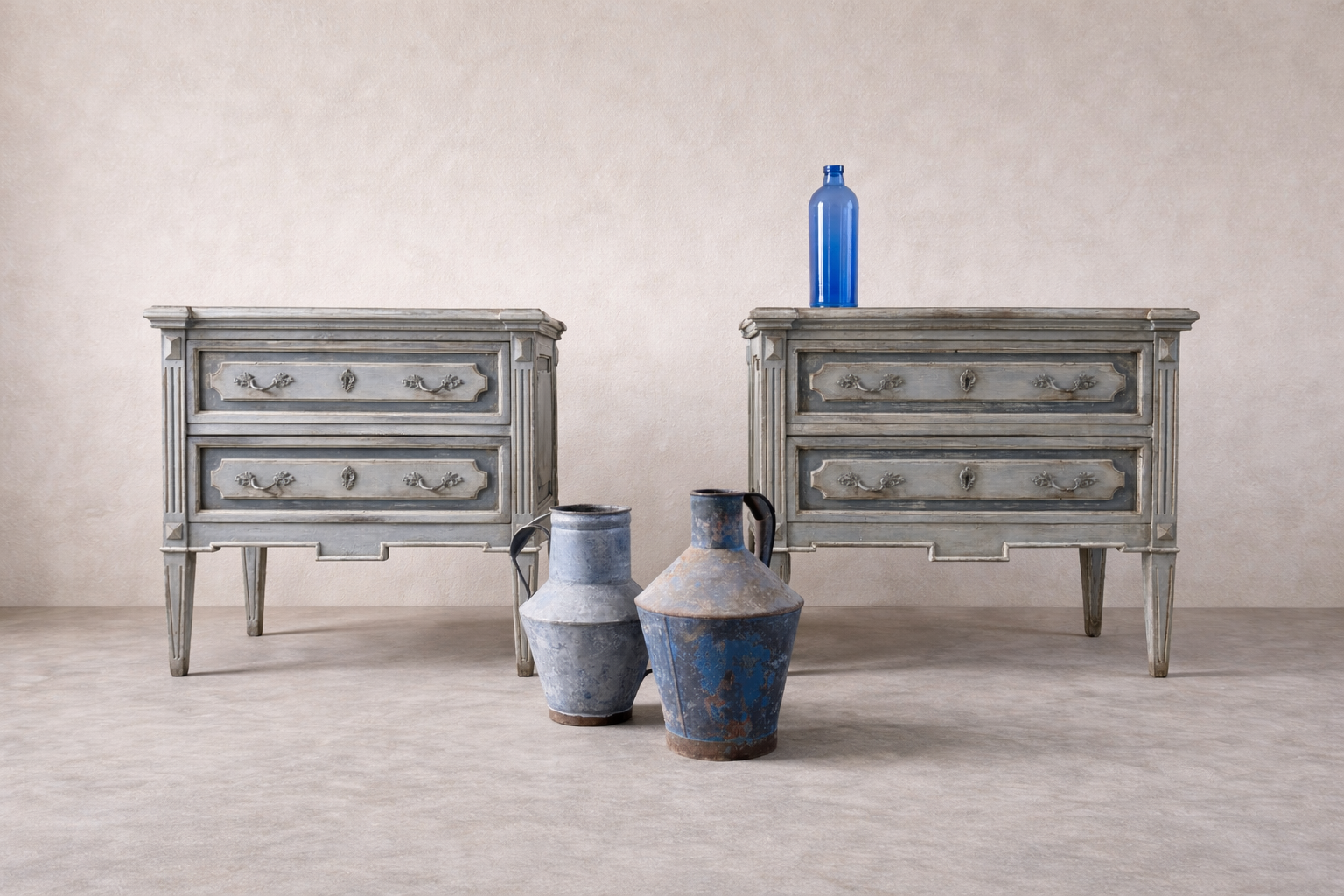 Elegant pair of Italian 19th century bedside tables, newly painted in a soft, understated finish, blues and greys, that complements their original proportions and carved details.