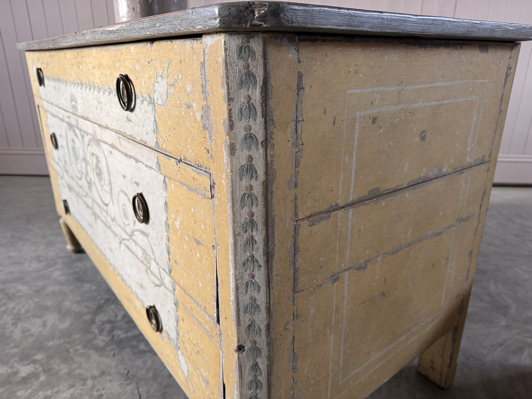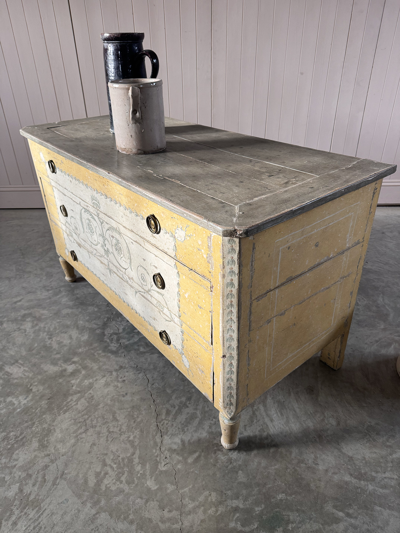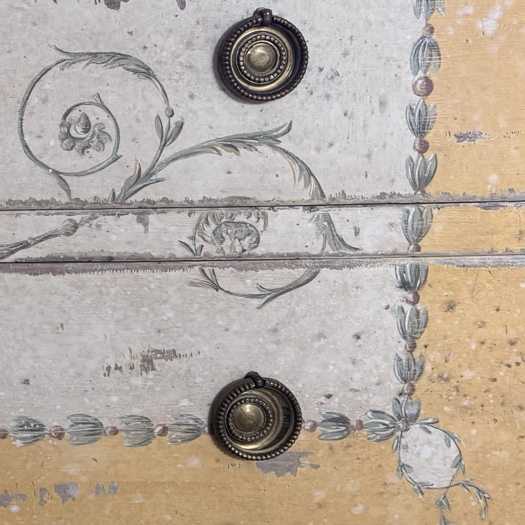 A charming French provincial chest of drawers, dating to the late 18th or early 19th century, finished in its original painted surface. The piece retains a beautifully timeworn palette of soft ochre and pale grey, enriched by delicate hand-painted neoclassical motifs to the drawer fronts. Standing on turned tapering legs, with later patinated brass ring pulls that sit comfortably with the overall aesthetic. The worn paint, visible brushstrokes, and gentle surface losses contribute to its authentic character and quiet elegance.