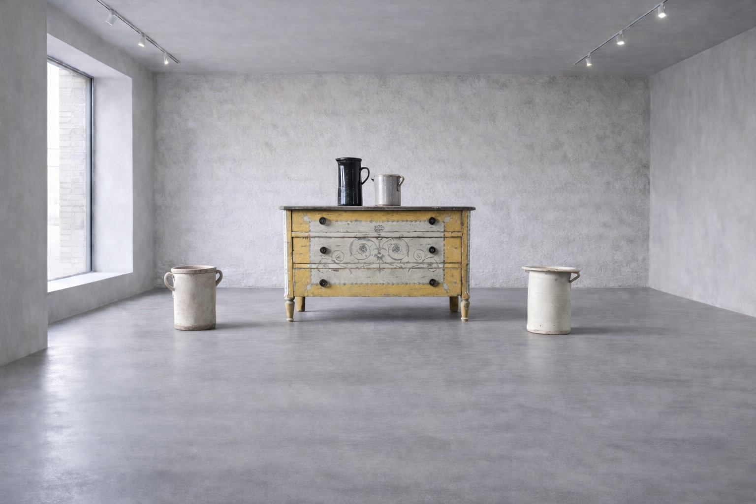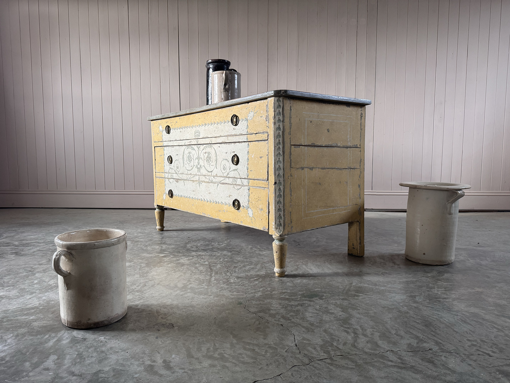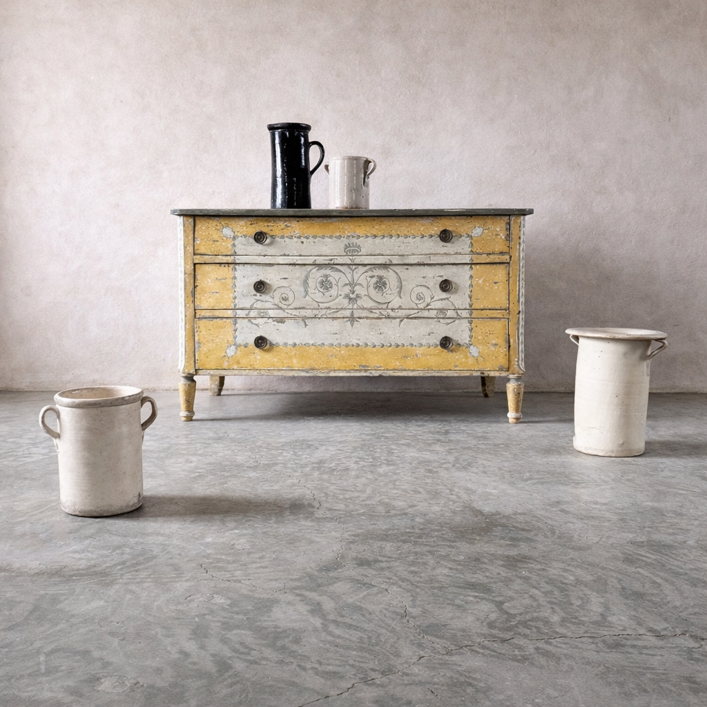 A charming French provincial chest of drawers, dating to the late 18th or early 19th century, finished in its original painted surface. The piece retains a beautifully timeworn palette of soft ochre and pale grey, enriched by delicate hand-painted neoclassical motifs to the drawer fronts. Standing on turned tapering legs, with later patinated brass ring pulls that sit comfortably with the overall aesthetic. The worn paint, visible brushstrokes, and gentle surface losses contribute to its authentic character and quiet elegance.
